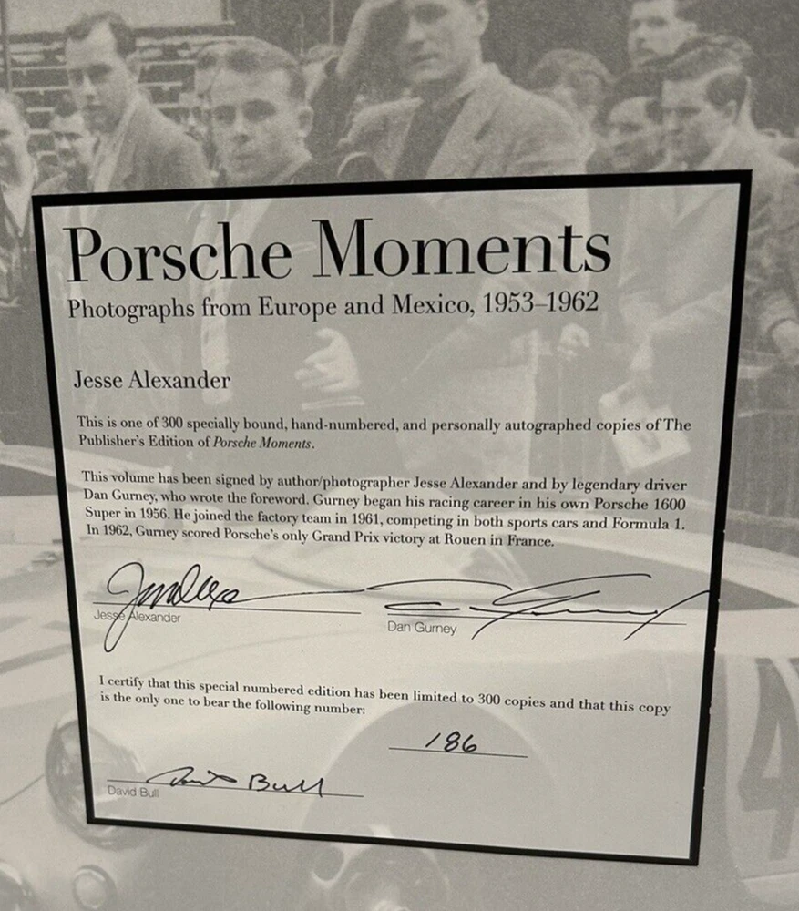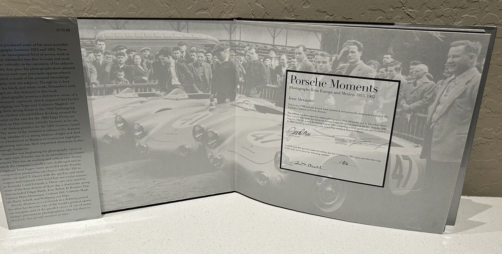 PORSCHE MOMENTS Photographs from Europe and Mexico 1953-1962 Limited Special Number Edition 186/300 Publisher’s Edition of Porsche Moments: Photographs from Europe and Mexico, 1953-1962 written and photographed by Jesse Alexander and published by David Bull Publishing in 2006. This book is #186 of 300 specially bound and signed copies by David Bull. Foreword written by Dan Gurney. Excellent condition and great collector item. Please see pictures and ask questions. Thank you.