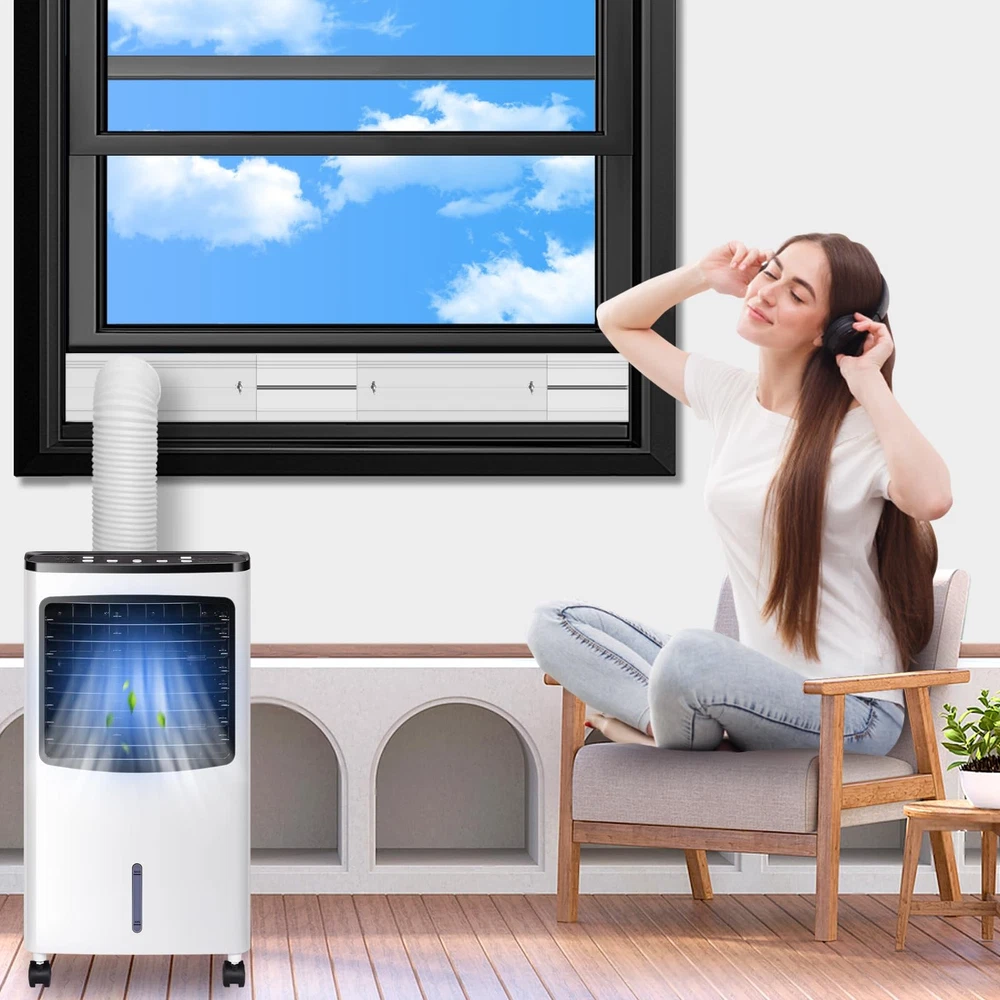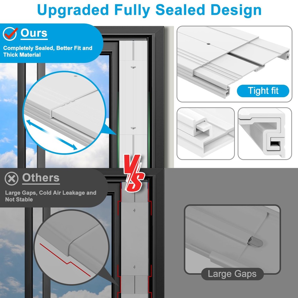 Upgraded Universal Portable AC Window Vent Kit for Sliding Window Color: White Material: PVC/ABS/PP, Stainless steel bolt Adjustable Length: 43cm/16.93inch-155cm/61inch Applicable Windows: Vertical and Horizontal Sliding windows, sliding door Applicable Device: All conditioners with an outlet diameter of 5.1 inches or 5.9 inches Package : 4 x Upgraded Sealing Plates 1 x Universal Hose Coupler/Adaptor 1 x Rain Cover with Grid 4 x Screws 1 x Sealing Tape 10ft 1 x User Manual Installation Steps: Instruction is in the package. Assemble Plates: Install the screw and nut fittings on the outer plate, insert the oval metal piece into the track of inner plate. Placed the assembled plate on the window, adjust it to an appropriate length and tighten the screws. Screw the coupler into the exhaust hose of the conditioner. Insert the coupler into the hole of the board. Post the sealing tape to the gap between the edge of the window and sealing plates to achieve a good sealing effect 【Universal Coupler for 5.1 inch & 5.9 inch Exhaust Hose】: This 2-in-1 patented coupler has an Internal thread suitable for exhaust hoses with a diameter of 5.1 inches (clockwise and counterclockwise), and an External thread suitable for exhaust hoses with a diameter of 5.9 inches (counterclockwise only). You can easily connect all your conditioning hoses without hassle. (Hose not ) 【Upgraded Seamless, Better Sealing Effect】: The portable conditioner window vent kit can be perfectly embedded in windows rail to achieve a tight sealing effect. There is no gaps between the plate and the edge of the window, effectively blocking the leakage of cold and the entry of hot into the room, keeping the room cool and more energy-efficient. 【Grid Filter & Rain Cover】: The universal coupling has a built-in grid to prevent birds, mice, snakes and garbage from entering the AC vent hose and damaging your conditioner components. The rain cover can effectively prevent rain and wind from entering, and let the hot escape downward, allowing you to better enjoy the convenience of our conditioner window vent kit. 【Thickened and Durable Adjustable Panels】: The maximum adjustable length of the 4 window panels is 155cm/61 inches, meeting the needs of different window heights and suitable for most horizontal and vertical sliding Windows. Our AC unit window kit is made of a new reinforced PVC material, featuring superior heat resistance, wear resistance, aging resistance and durability. It has a longer life and can be reused repeatedly. 【What You 】: The portable AC duct kit includes 4 x Window Seal Plates, 4 x Screws, 1 x Universal Hose Adapter with Grid, 1 x Rain Cover, 1 x Sealing Tape, 1 x User Manual. All are easy to install or disassemble, no tool needed, convenient to when not in use, and save space.