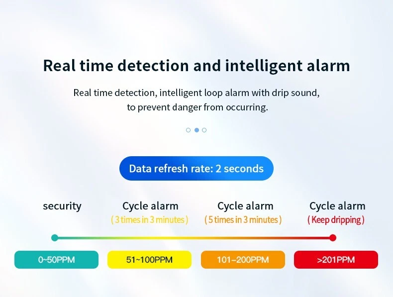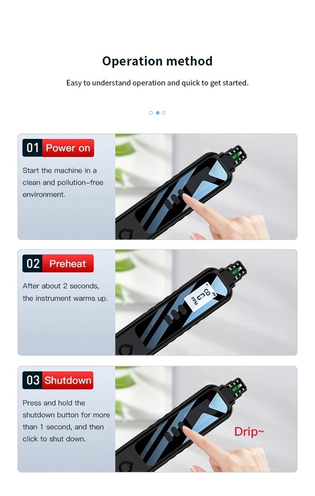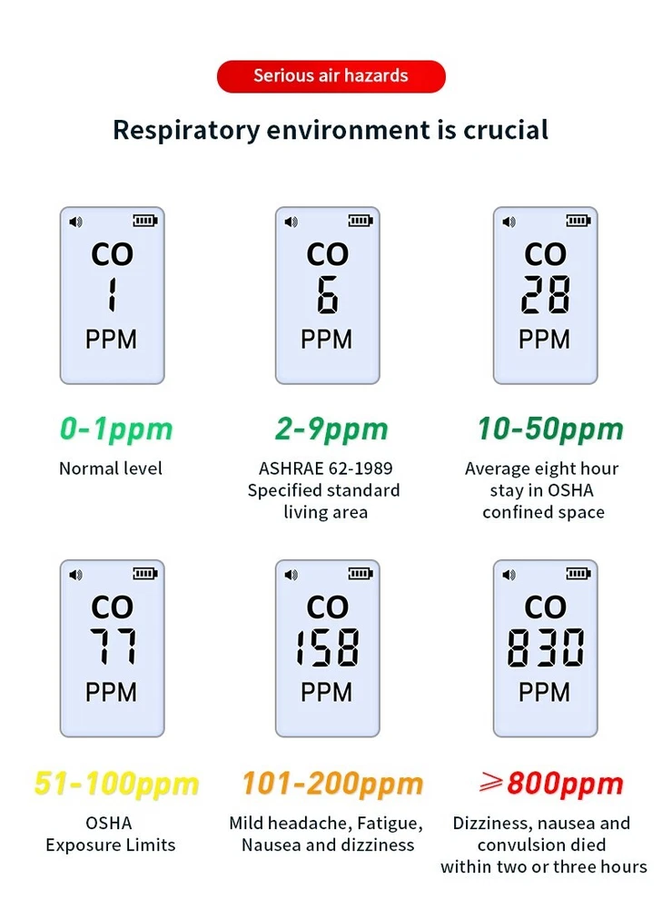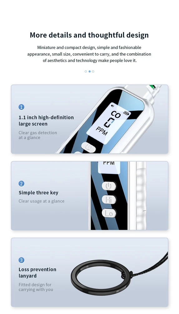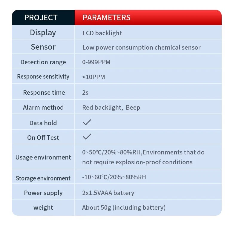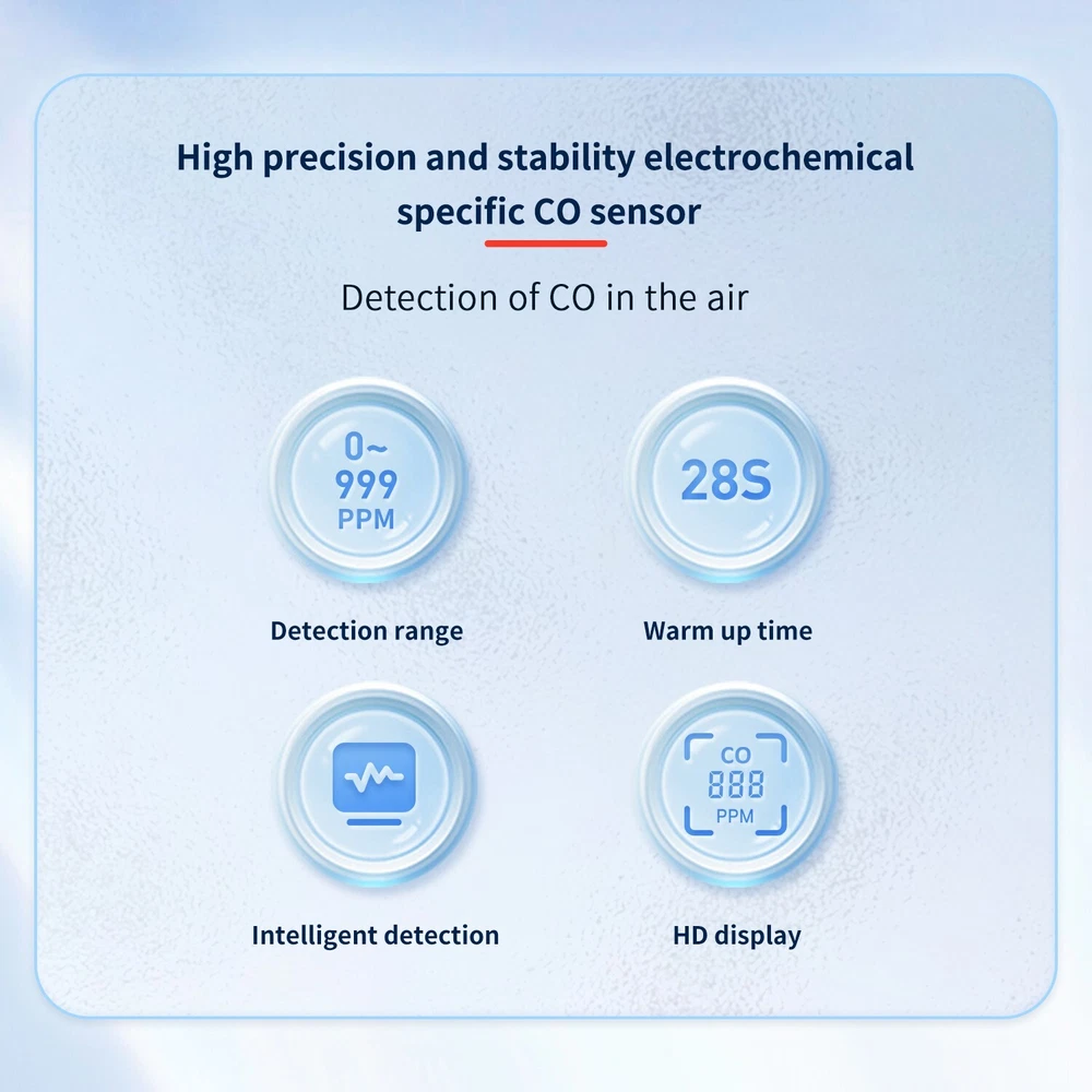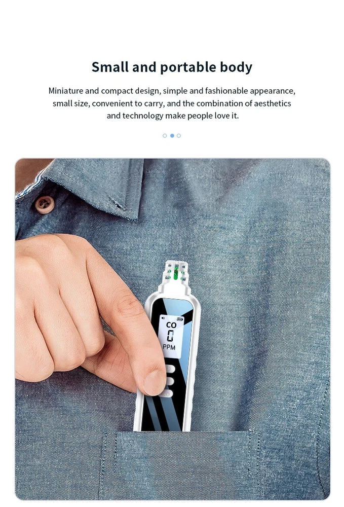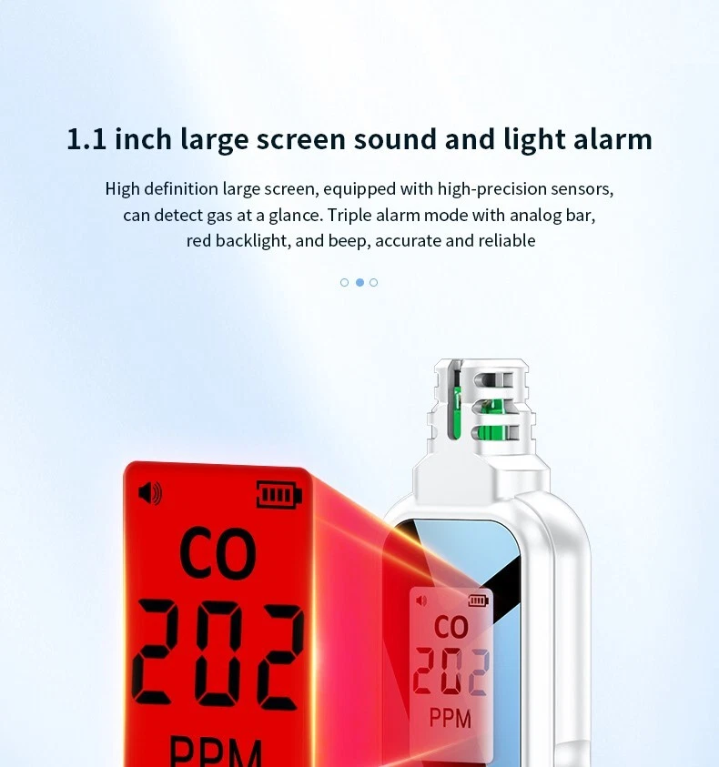 Portable Carbon Monoxide Detector HD07, High Precision CO Gas Leak Alarm, Compact & Lightweight. Ensure your safety with the HD07 Carbon Monoxide Detector — a compact, highly accurate device designed for quick detection of CO gas leaks. Whether you're at home, in the garage, or on the go, this easy-to-use detector helps you quickly locate carbon monoxide leaks to prevent potential danger. Key Features: High Precision Sensors : Electrochemical sensor technology provides accurate and stable CO detection with a range of 0-999 PPM and an accuracy of ±1 PPM. Audible & Visual Alarm : Features a triple alarm system with a visual red backlight, a beep sound, and an analog bar for clear and immediate alerts. Quick Response Time : Cools down quickly with a warm-up time of just 28 seconds for fast detection. Low Power Consumption : Powered by 2 AAA batteries, designed for long-lasting use with low energy consumption. Compact & Portable : Small, lightweight, and easy to carry, making it perfect for travel, camping, or everyday use. Durable Construction : High-strength ABS body ensures the detector is tough, wear-resistant, and long-lasting. Battery Indicator : The large 1.1-inch LCD screen includes a low battery reminder, ensuring you're never caught off guard. Detachable Battery Compartment : The back cover is removable, making battery replacement easy and hassle-free. Specifications: Model : HD07 Size : 134.5 32.5 16mm (compact and lightweight) Weight : 50g (net weight), 100g (with packaging) Measurement Range : 0-999 PPM Measurement Accuracy : ±1 PPM Display : 250*280 resolution, high-definition screen Power Supply : 2 x AAA batteries (included) Warm-Up Time : 28 seconds Material : ABS Applications: Perfect for detecting carbon monoxide in any area prone to leaks, such as: Homes : Protect your family from CO poisoning. Garages and Workshops : Monitor CO levels when working with engines or other potential sources. Camping : Keep safe in tents or RVs where gas leaks could occur. Vehicles : Ideal for checking CO levels in car interiors or other enclosed spaces. Package Includes: 1 x Carbon Monoxide Detector HD07 1 x User Manual 2 x AAA Batteries (pre-installed) 1 x Gift Box Packaging Stay Safe & Prevent CO Poisoning! This carbon monoxide detector is your first line of defense against CO buildup in your environment. With its precision, ease of use, and portability, the HD07 ensures you're always prepared. Don’t wait for the danger — buy it today and stay protected!
