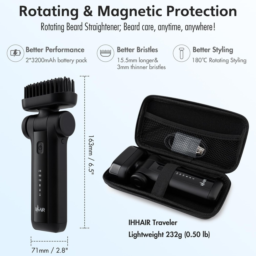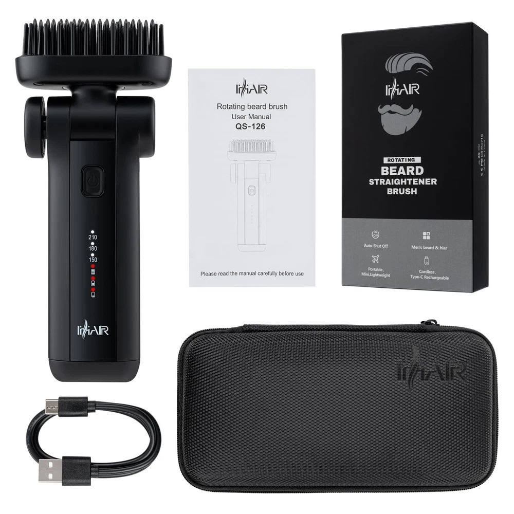 Portable Beard Straightener Brush Men Use,USB Rechargeable,6400mAh Battery,360° Anti-Scald Heated Comb,Fast Heating,Beard Straightener Brush for Short & Long Beards,Ideal for Home & Travel Product Details Product Benefits: beard/hair Straightening Shape: Comb Brand: Ihhair Hair Type: All Material: Ceramic, Plastic Product Dimensions : 6.4 x 1.37 x 1.37 inches; 8.18 ounces Item model number : QS126 Batteries : 2 Lithium Ion batteries required. (included) Date First Available : June 29, 2024 Manufacturer : IHHAIR Country of Origin : China Best Sellers Rank: #437,643 in Beauty & Personal Care (See Top 100 in Beauty & Personal Care) #553 in Beard & Mustache Combs #553 in Beard & Mustache Combs Customer Reviews: 3.7 3.7 out of 5 stars 20 ratings Safe Design: With a protective safety cover for the comb teeth and an anti-scald 360 comb, our mini beard straightener prevents accidental burns. Cordless and Rechargeable: Powered by a 6400mAh battery and USB rechargeable, this beard straightener is portable and easy to charge. Quiet Operation: Our beard straightening brush operates silently, ensuring a peaceful grooming experience. Fast and Even Heating: Utilizing MCH technology, this portable beard straightener heats up quickly and evenly for efficient styling. Sustainable use time: 30-45mins Smooth and Straighten: The cordless beard straightener's comb teeth distribute heat evenly, smoothing and straightening your beard.