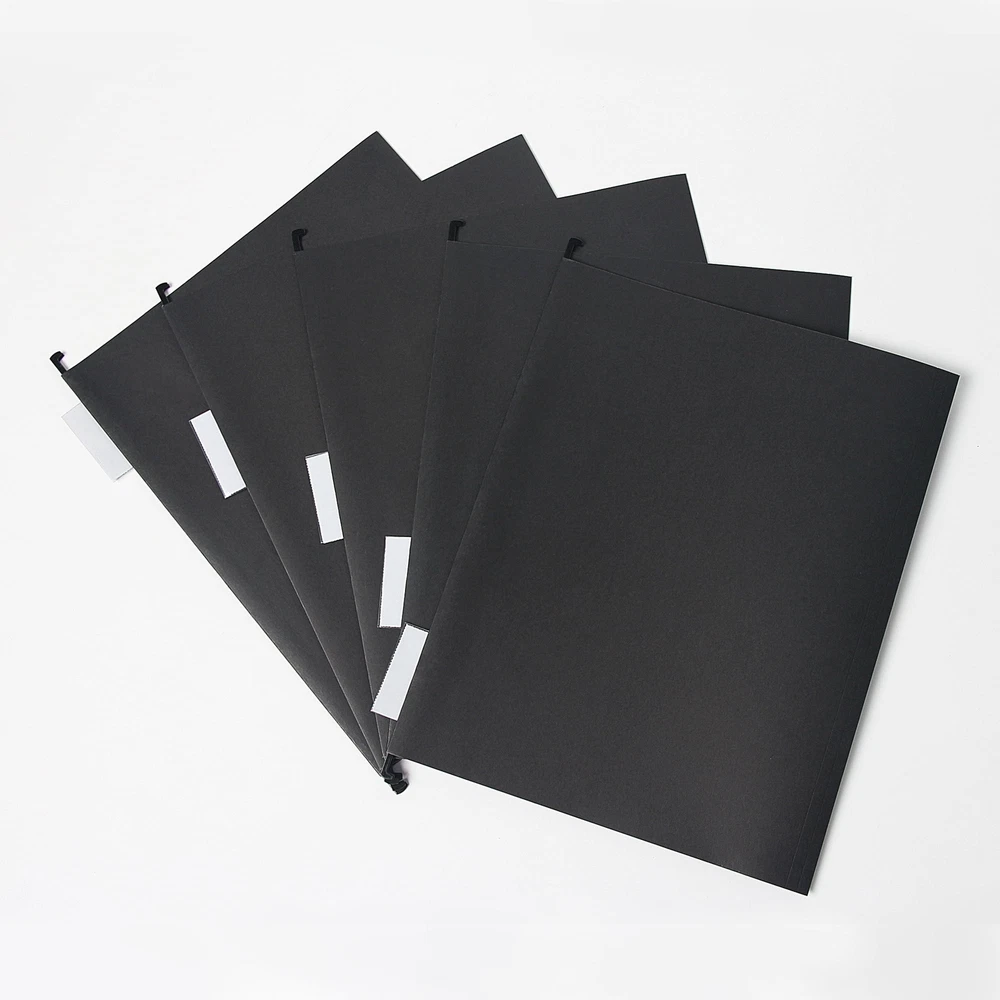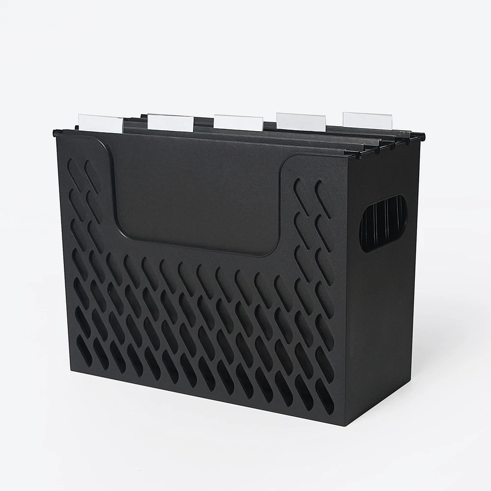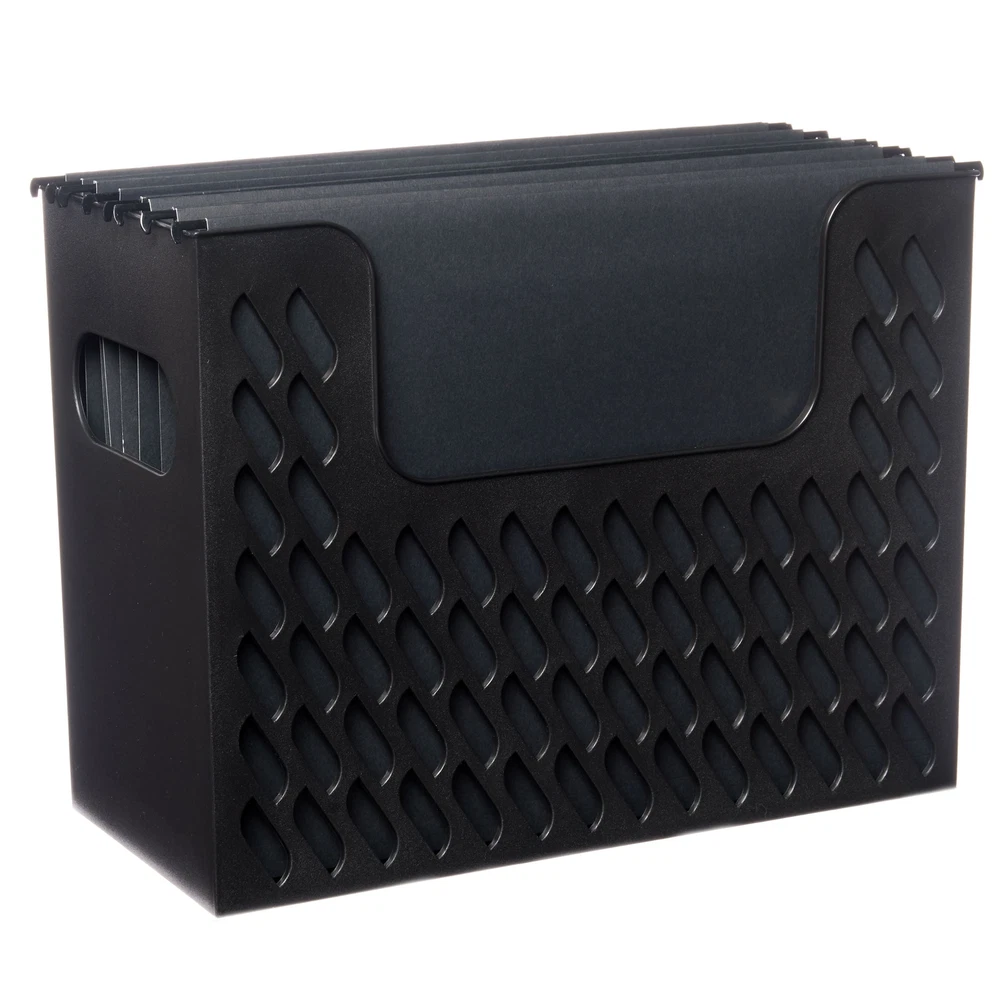 Portable Black File Box with 5 Hanging Folders, Letter Size, perfect for organizing frequently used documents and keeping them easily accessible! This black file box contains 5 letter-sized hanging folders with clear labels and inserts to help you organize your documents. Product size 12.28 inches * 6.02 inches * 9.41 inches, large capacity, can hold about 12 letter-sized hanging folders. With convenient side handles, it is perfect for placing on the desktop in the home office or homeschool room, or for transporting to and from the classroom or workplace. Portable Black File Box with 5 Hanging Folders Built-in handles also make it easy to carry, whenever you need to take your work with you Can be placed on the desktop or in a file drawer Hand holes for easy carrying Includes 5 hanging folders