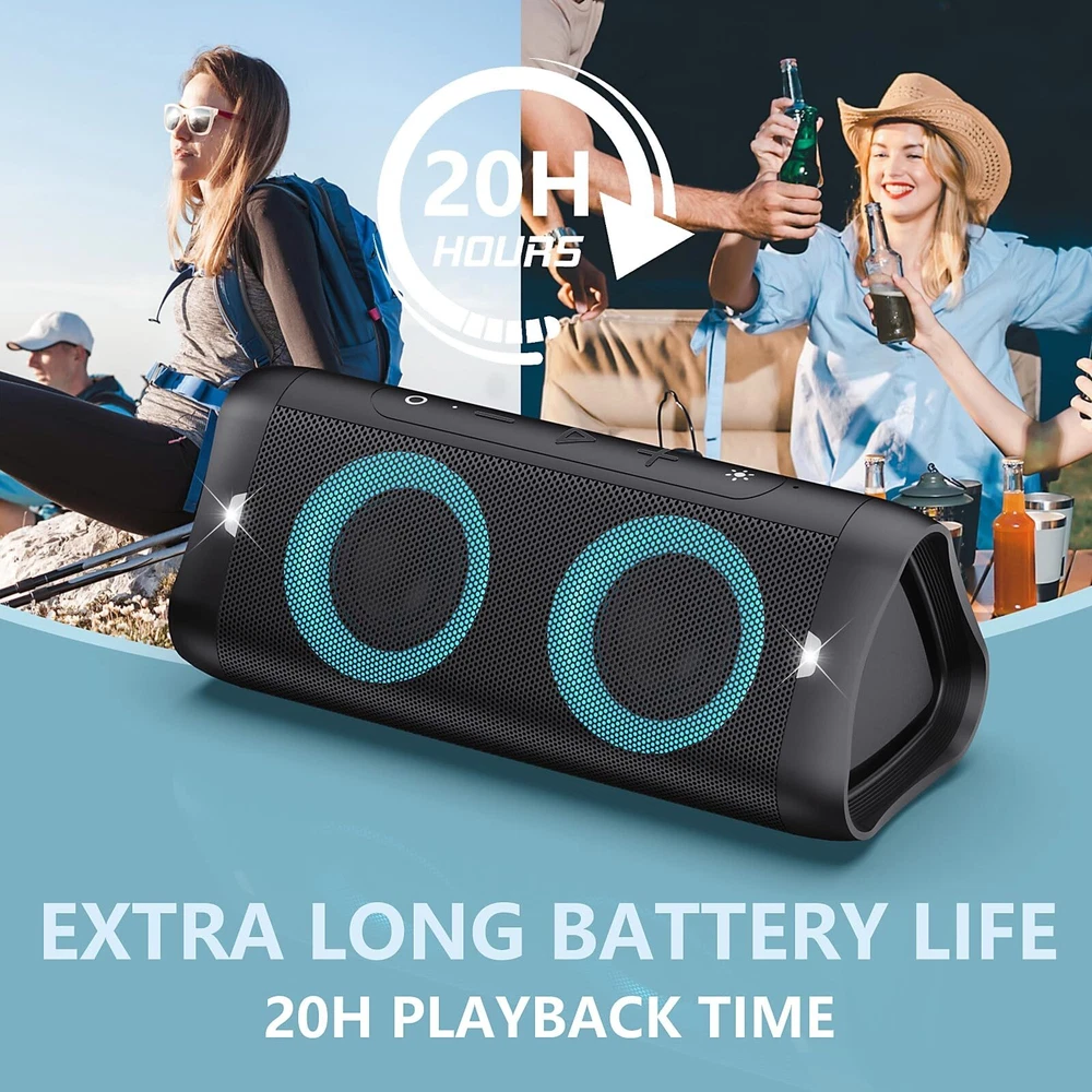 1)【30W High-Fidelity Stereo Sound】Bluetooth speaker comes with top-notch dual high-performance drivers and dual passive radiators to minimize the loss of sound quality and enhance bass. Exclusive DSP audio technology achieves clear highs, rich mids, and powerful bass. Provide an immersive stereo sound experience for all music, gaming, and movie lovers! 2)【Dynamic Light Show Sync Music Beats】speakers bluetooth wireless offer 7 light effects, you can change the rhythm mode of the lights based on the type of music you play. The strobe lights on both sides of the speaker will flash with the beat of the music, and the colorful light show creates a hot atmosphere. Let wireless speaker light up your party to make it more energetic. 3)【Small body but loud enough】The biggest drawback of portable bluetooth speaker is that they are easy to carry but the sound is not loud enough. We hope there will be incredible volume in a small body, and its sound can fill any room and garage, so we developed this loud speaker in the most popular triangular shape for more stable placement and space-saving. 4)【IPX5 Waterproof Speaker】This bluetooth outdoor speaker features a durable design and an IPX5 rating for protection against water splashes and spills. It is perfect for outdoor events such as the pool, beach, camping, biking, hiking, etc. No need to worry about the weather and the environment. 5)【Two Playback Methods】You don't have to worry about this speaker not being compatible with your existing devices. It supports Bluetooth 5.3 technology to ensure a fast and stable connection. The range is up to 100 feet without obstacles. Besides this, you can also use the 3.5 AUX input port to connect your device. Both methods can connect with your preferred device effortlessly to play music.