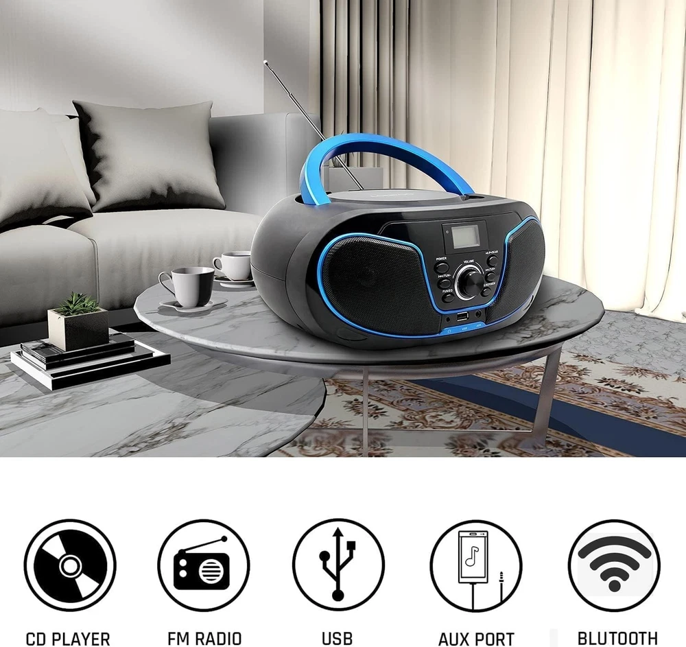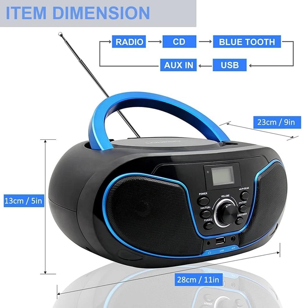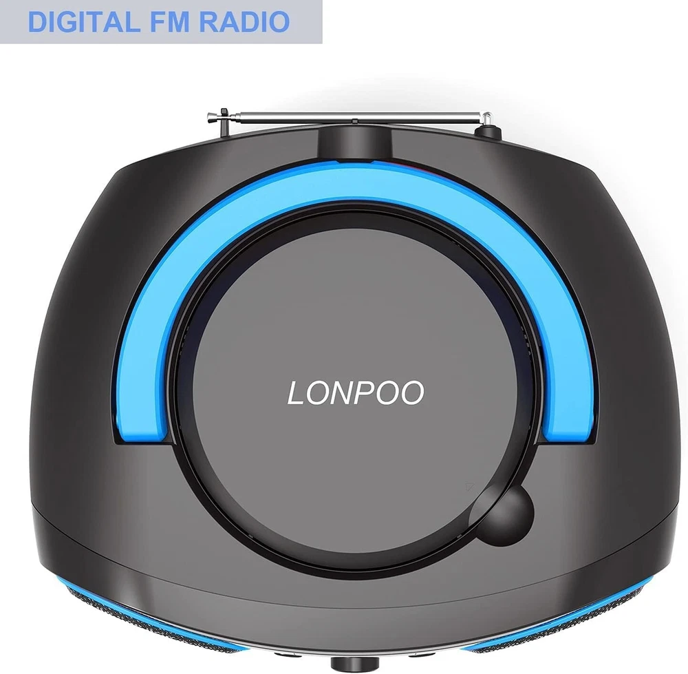 CD Player Boombox, LP-D02 Portable Bluetooth FM Radio Stereo Sound System with Crystal-Clear Sound, MP3 Playback, USB Input, AUX Input, Headphone Jack, LCD Display, AC DC Operated 【Portable Top Loading CD Player Boombox】LONPOO Portable Boombox supports most of the format such as CD, CD-R, CD-RW, LED CD Track Display. 【Blutooth Speaker Function】It becomes a HiFi Blutooth speaker while its built-in Blutooth receiver connects with Blutooth-enabled devices such as mobile phone or tablet. (NOTICE: This CD player is not with a Blutooth transmitter function and it can't connect other Blutooth speaker or headphone via Blutooth.) 【Wired Speaker Function】Play your music from Smartphone, Table or PC via Aux-input (a 3.5mm aux cable included) connection, Through the Headphone jack you can enjoy your favorite tunes via headphones. 【Multi-function CD Player】①. Portable Boombox CD Player ②. Blutooth HiFi Speaker ③. FM Radio ④. AUX Input ⑤. Support USB and A to B Repeater. 5 in 1 Player makes your life more colorful and bringing unforgettable feelings and memories. 【Portability】The boombox is powered either by AC (100-240V) or If you like to take your music to go, simply by using Type-C (UM-2) batteries x 4 (Not Included). Enjoy the music anywhere and anytime.