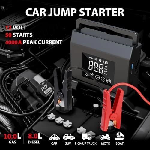 Return Policy Fast Delivery Trusted seller Portable Car Jump Starter with Air Compressor, 150PSI 4000A Fast Battery Jump Starter Charger with Digital Tire Inflator, Pack with Type-C Quick Charge Product Description 【4000A Jump Start Battery Pack】The 15,000mAh jump starter is equipped with a peak current of 4000A, enabling it to start 12V vehicles (10.0L gasoline/8.0L diesel engine, including hybrid power) in just 3 seconds. Even in low temperatures (-20°F to 70°F), it exhibits superior starting performance with just 80% battery capacity. This portable jump starter can initiate the vehicle up to 50 times and boasts a service life of over 1000 charge cycles. 【Built-In Smart Air Compressor】Smart preset & auto shut-off without repeated adjustment and check. It provide maximum pressure of 150 PSI and airflow of 8L/Min! Only need 8 mins to fully inflate a 205/55 R17 car tire or 3 min to refill 305/65 R18 car tire in daily situation. (Testing data base on a flat standard tire 185/65/R15R) It can be used for Car, Bicycle, Motorcycle, Basketball, Pool Toys using. DOES NOT SUPPORT heavy duty truck tires. 【4-IN-1 Multi-Function】Not only a car battery booster, a Tire Pumper, but also a portable power bank, a LED flashlight. Support fast charging/USB 3.0, adapt smart phones, tablets and other USB devices. Input:5V/1A, Output:12V/2A. The integrated 300-lumen LED flashlight has 4 lighting modes, constant lighting, flash and SOS,Warning. 【Smart Cordless Inflator with LCD Display】The car jumper starter supports smart preset & auto shut-off without repeated adjustment and check. With unique turbocharged 8L/Min (150 PSI) lasting 6 minutes, jump starter provides fast and proper inflation to various tires, balls, etc. Friendly design with real-time data reading, detachable extended air hose and 3 optional unit switching for covenience. 【WHAT YOU GET】 1 x Smart Air Pump, 1 x Air Tube(60cm/23.6in), 1 x Inflating Needle, 1 x Inflatable Nozzle, 1 x Pesta Valve, 1×Emergency Start Power Clip, 1 x Type C Cable, 1 x User Manual. 18 months warranty and tech support. If you have any after-sales questions about jump starter, please feel free to contact us.Note: Please do not use the air pump function continuously over 6 minutes. When the tire battery compressor is seriously hot, please cool down for a few minutes before continuing to inflate the tire. Shipping Returns Payment Shipping Shipping is FREE to all addresses other than APO/PO boxes in the lower 48 states. All our stock ships from US-based warehouses. Shipped via USPS or UPS (depending on location and package weight) Unless stated otherwise, all orders will ship within 24-72 hours of your payment being processed. Check our feedback to see the great reviews of FAST shipping we offer. Returns Seller does not accept returns Payment We currently accept payment via eBay managed payments only. Once payment is cleared, we will dispatch your shipment within 1-3 business days. Please refer to the "Shipping" tab for more information regarding shipping speed to your destination.