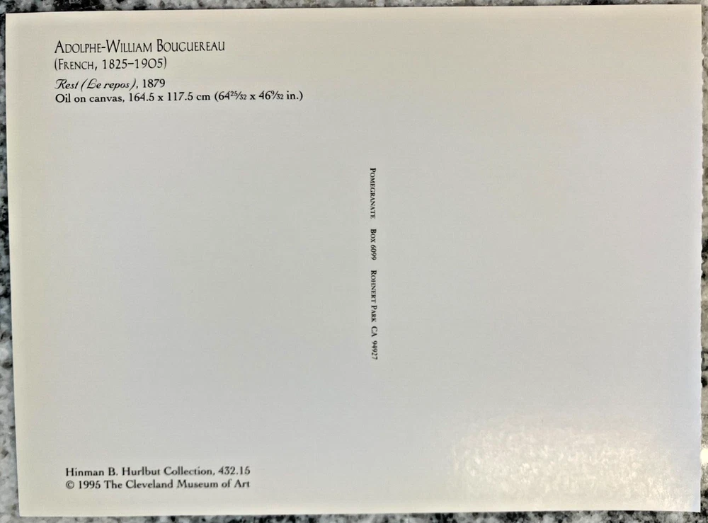 Postcard: Rest (Le repos) by Adolphe-William Bouguereau, painted 1879, printed 1989, unposted, oversized, excellent condition. Housed at Cleveland Museum of Art.