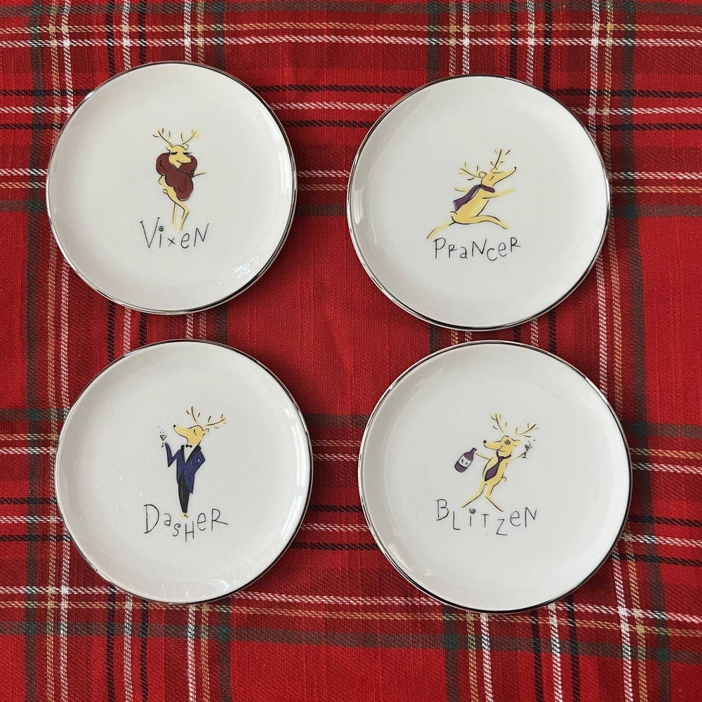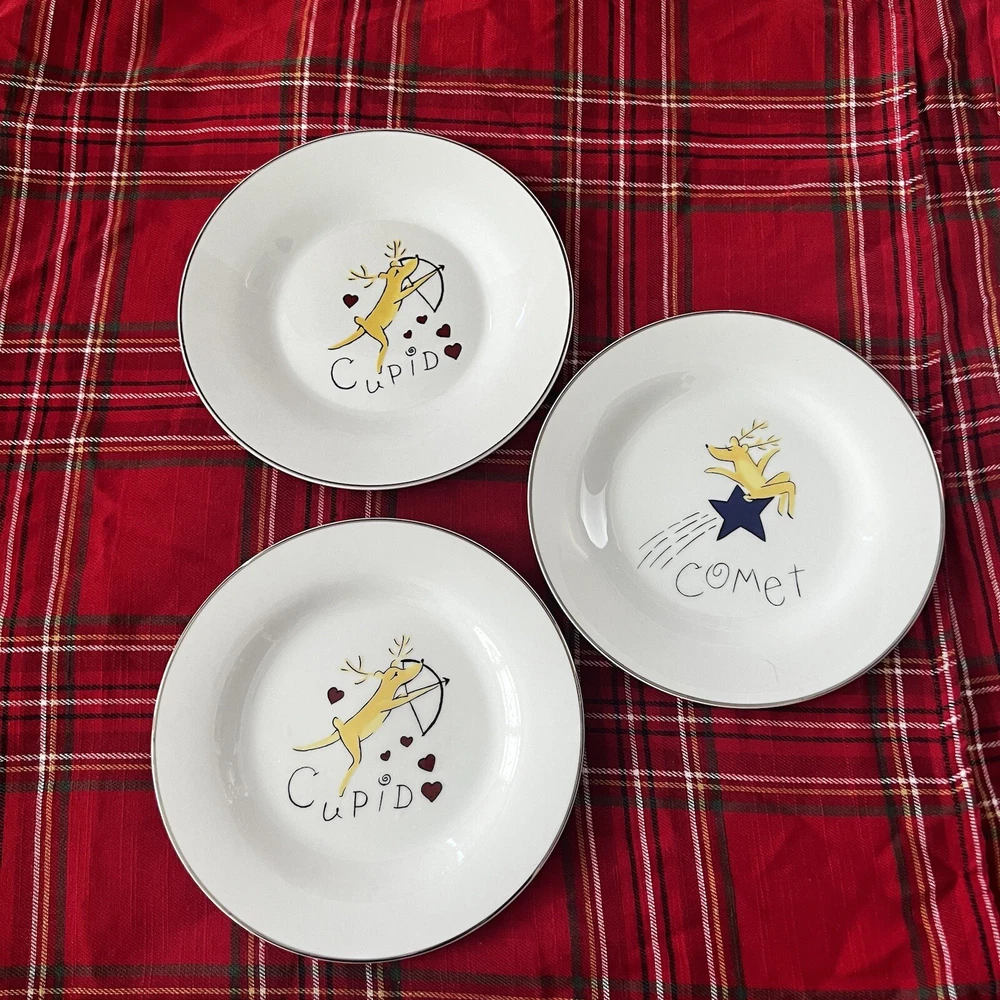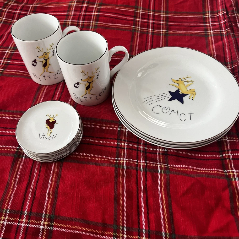 Add festive cheer to your dining table with this 9-piece Pottery Barn Reindeer Holiday Dishes set. The set includes 3 dinner plates (2 Cupid, 1 Comet), 4 4” appetizer plates (Prancer, Vixen, Dasher, Blitzen) and 2 Blitzen coffee mugs, perfect for serving or displaying during the Christmas and winter season. The set features a beautiful white color and is made of high-quality porcelain and ceramic materials, ensuring durability and longevity. The set is designed with a holiday theme, featuring characters such as Vixen, Comet, Prancer, Dasher, Blitzen, and Cupid, making it a perfect addition to your home décor.