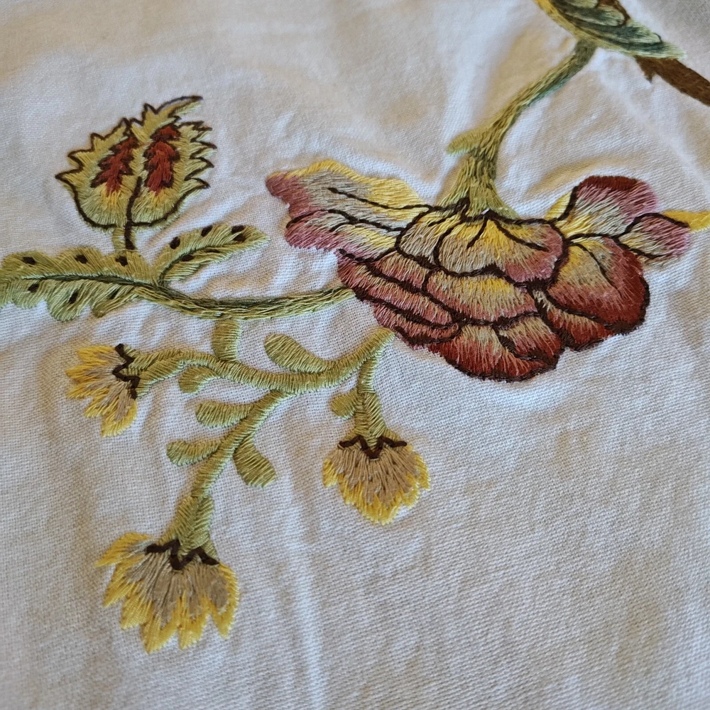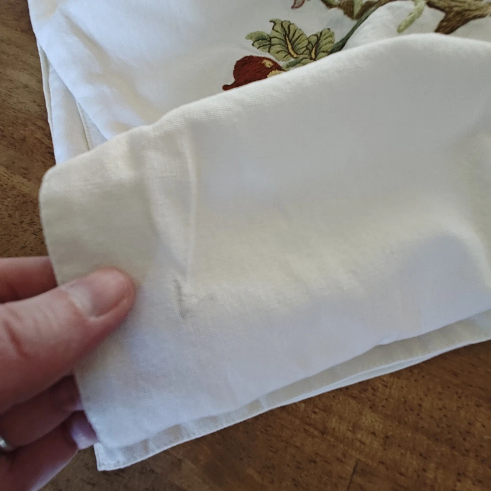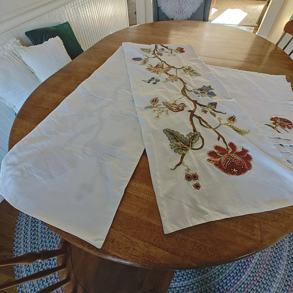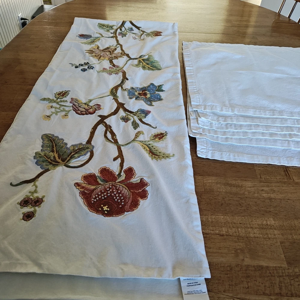 Pottery Barn Table Runner Crewel Embroidered Floral Vine 18"x 90" W/ 6 Napkins See in the photos there is one grey mark on the runner. Otherwise, clean and in gently used condition! The napkins are in great condition with some signs of use but overall very clean. Thanks for looking!