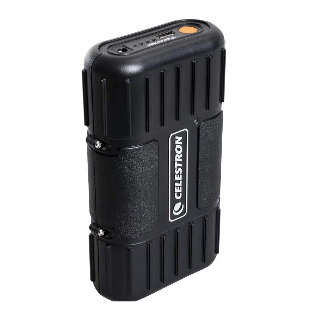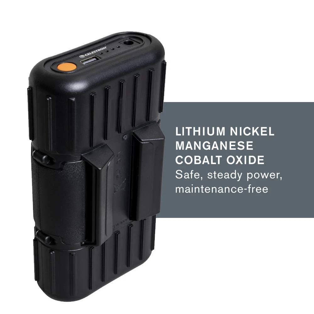 Keep your telescopes, smartphones, tablets, GPS systems, cameras and other USB-powered devices charged and ready with PowerTank Lithium LT—the ideal outdoor portable-charging solution. specially designed this product with the needs of amateur astronomers in mind; it’s packed with useful features. First, you’ll find a 12V connection for your telescope—no cigarette lighter port needed. Once your telescope is connected, attach the battery securely to one of the tripod legs with the included Velcro straps so it is safely out of the way. One USB port keeps your other devices charged, and can be used simultaneously with the telescope charger. When you’re not observing, keep this battery charged and at the ready for unexpected emergencies. PowerTank Lithium LT’s unique Nickel Manganese Cobalt Oxide chemistry which delivers a steady charge over long periods and requires less maintenance than a traditional sealed lead-acid battery. It will last you many times longer thanks to its un-recharged shelf life of 10 years and 2000 charge cycle lifespan. But most importantly, the PowerTank Lithium LT can withstand higher temperatures than standard lithium cobalt batteries and will not be a fire danger if accidentally punctured. All this combined with its rugged design make PowerTank Lithium LT the perfect outdoor power supply. PORTABLE POWER MADE FOR ASTRONOMERS: The perfect solution for most computerized telescopes, PowerTank Lithium LT features a regulated 12V connection, 8 hours of battery life, a USB port, and more. Mounts directly to the tripod leg. SMALLER, LIGHTER, SAFER: Unique Lithium Nickel Manganese Cobalt Oxide chemistry delivers a steady charge over long periods and requires less maintenance than a traditional sealed lead-acid battery. 5 YEARS OF DEPENDABLE PERFORMANCE: Unlike other batteries with limited lifespans, PowerTank Lithium LT will be your companion for 5 full years of astronomy adventures. WORKS WITH A VARIETY OF DEVICES: 12V connection works with all current computerized telescopes. Also includes one onboard USB port to charge your smartphone or other USB-powered devices in the field. AN EMERGENCY KIT ESSENTIAL: Keep PowerTank Lithium LT charged and ready for unexpected power outages. UNBEATABLE WARRANTY & SUPPORT: Buy with confidence from , a leading telescope brand in California since 1960. Your purchase includes a 2-Year US Warranty and unlimited support from our team of US-based experts.
