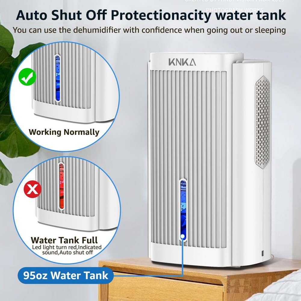 POWERFUL PERFORMANCE: Our small dehumidifier effectively absorbs up to 40oz excess moisture per day (Tested at 86°F, 80% RH), keeps the room humidity below 45%-65% (The suitable humidity for the human body is 40%-60%), Basement dehumidifier is effectively eliminate damp odor and improve human comfort. Dehumidifiers can cover 1000 sq ft and are perfect for bathrooms, basements, bedrooms, and RVs. SLEEP WELL: Thanks to advanced semiconductor technology, in sleep mode, the small bathroom dehumidifier's noise level is as low as 30 decibels, which will not keep you awake at night, and the portable dehumidifier lights will automatically turn off. OVERFLOW AUTO STOP PROTECTION: Our small room dehumidifier is designed with a smart auto stop function. When the water tank is full or positioned incorrectly, a home dehumidifier will automatically stop working to prevent water overflow. This feature ensures your safety and convenience, even when you're not at home. To reduce the frequency of emptying the water tank, we specially equipped the dehumidifier with a 95-ounce large-capacity water tank. USER-FRIENDLY: Air dehumidifier for home has a simple design that sets up in seconds. just a couple of buttons to control power, lights, and quiet(sleep) mode. A quiet dehumidifier with a compact size of 13.78X7.95X6.22 inches, it can be seamlessly integrated into any space. 7 COLOR NIGHT LIGHTS: The smart dehumidifier is also equipped with a beautiful LED light, which not only adds a touch of elegance to the device but also acts as a functional indicator light (a red light turns on when the tank is full or in the wrong position), even in dimly lit rooms, the soft lighting also allows you to easily monitor the status of your equipment, ensuring you are always aware of its performance.