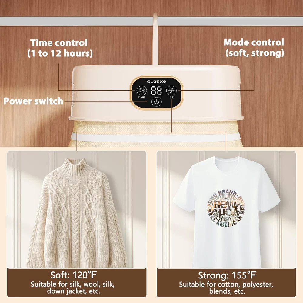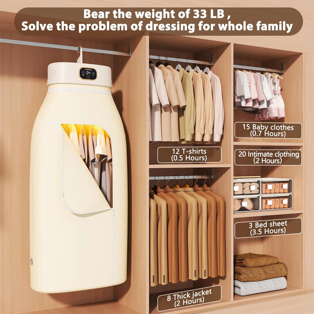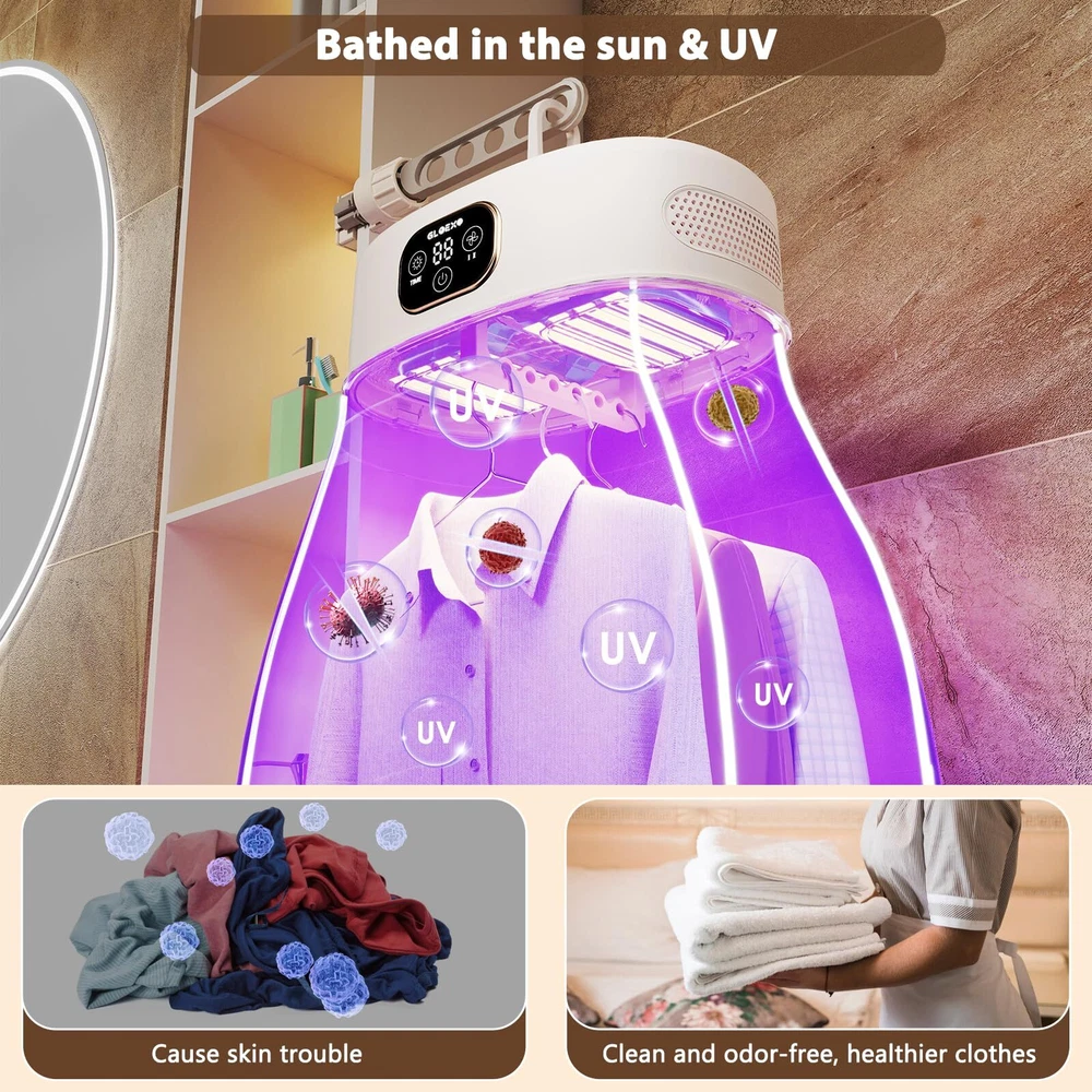 【Unprecedented Experience & Excellent Drying Effect】Dryer machine is equipped with the latest 600W pure copper heating sheet (more outstanding heating effect) and the unique double air duct for even heat emission in drying tent. Even the clothes at the bottom of the drying tent can be dried at the same time as the clothes on the top. 25 minutes to dry short sleeves; 45 minutes to dry jeans. After laboratory tests, actual drying effect of 600W clothes dryer is equivalent to that of 1200W dryer. 【Bathed In the Sun】Old portable dryer often produces a strange odor after drying, which makes you feel bad! electric portable dryer is equipped with UV, which participates in the whole process of drying clothes. It can not only remove the odor in the drying process, but also make sure the clothes don't additionally bother the skin. Make clothes feel better like drying in the sun, whether for adults or babies. 【Multi-gear Design & Timekeeping】Mini secadora portatil de ropa is equipped with 2-gear drying mode (soft: temperature set at 120℉, suitable for silk, wool, silk, down jacket, etc.; strong: temperature set at 155℉, suitable for cotton, polyester, blends, etc.). Mini dryer machine is also equipped with a timer for 1 to 12 hours. You can flexibly set the working time of the machine according to your life scene and different clothes. It will automatically turn off without safety risks. 【Weight-bearing Effect & Mute Effect】 After many experiments, the laundry compact dryer can bear the weight of33 LB at most. It can work normally even for the down jacket just washed. The daily use of clothes in a family can be easily handled. The mini dryer has excellent noise control. It will never affect your normal rest even if it works in the bedroom. 【Adapt to Multi-scene & Portable Design & Safety Design】With the installation extender(Random color), you can hang it in any area that can be fixed and near to the power socket. After fixing the extender, you can hang dryer and start drying. Dryer has a lightweight, portable design, for easy storage in a suitcase for business travel. The lower part of the heating sheet is equipped with a separate baffle (not owned by other products) for preventing scald accidents by accidentally touching the hea