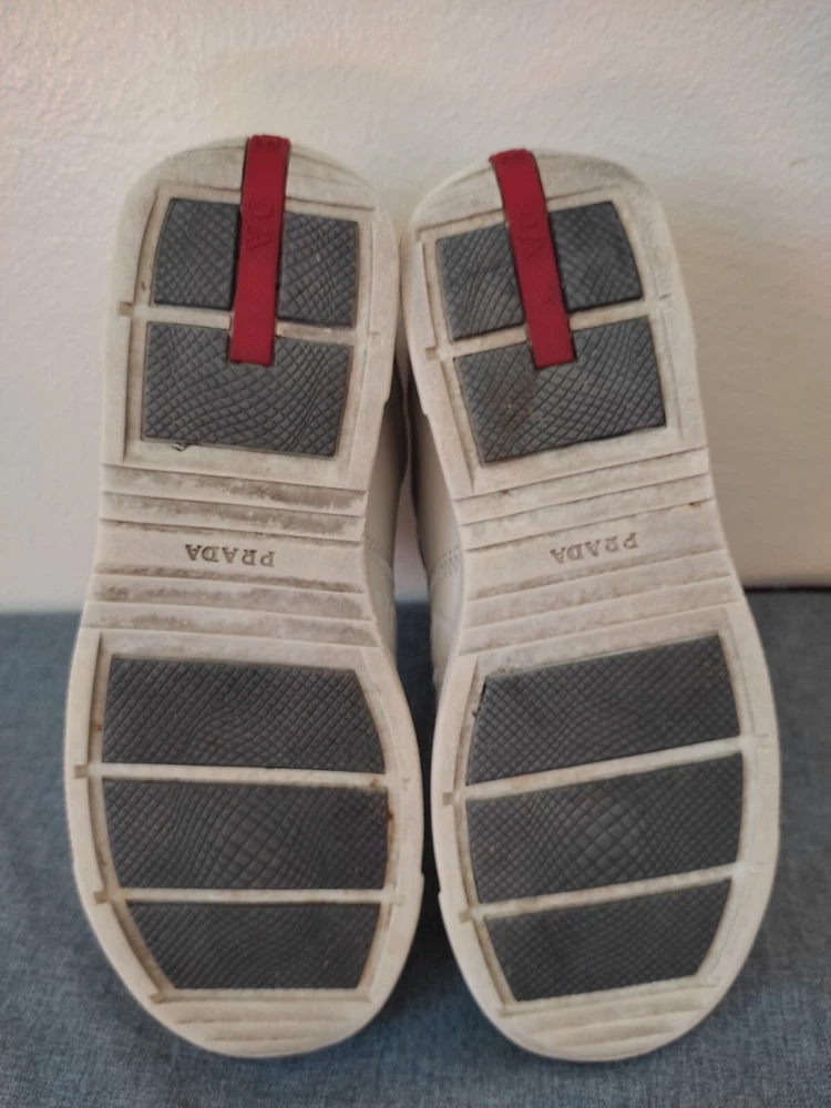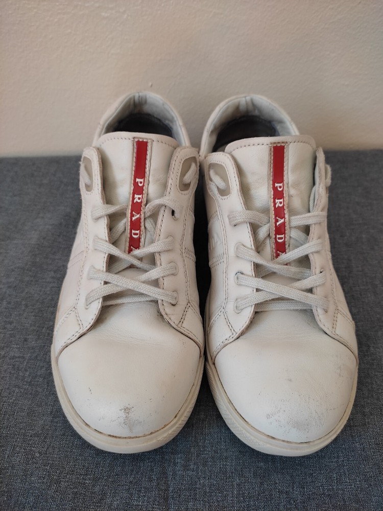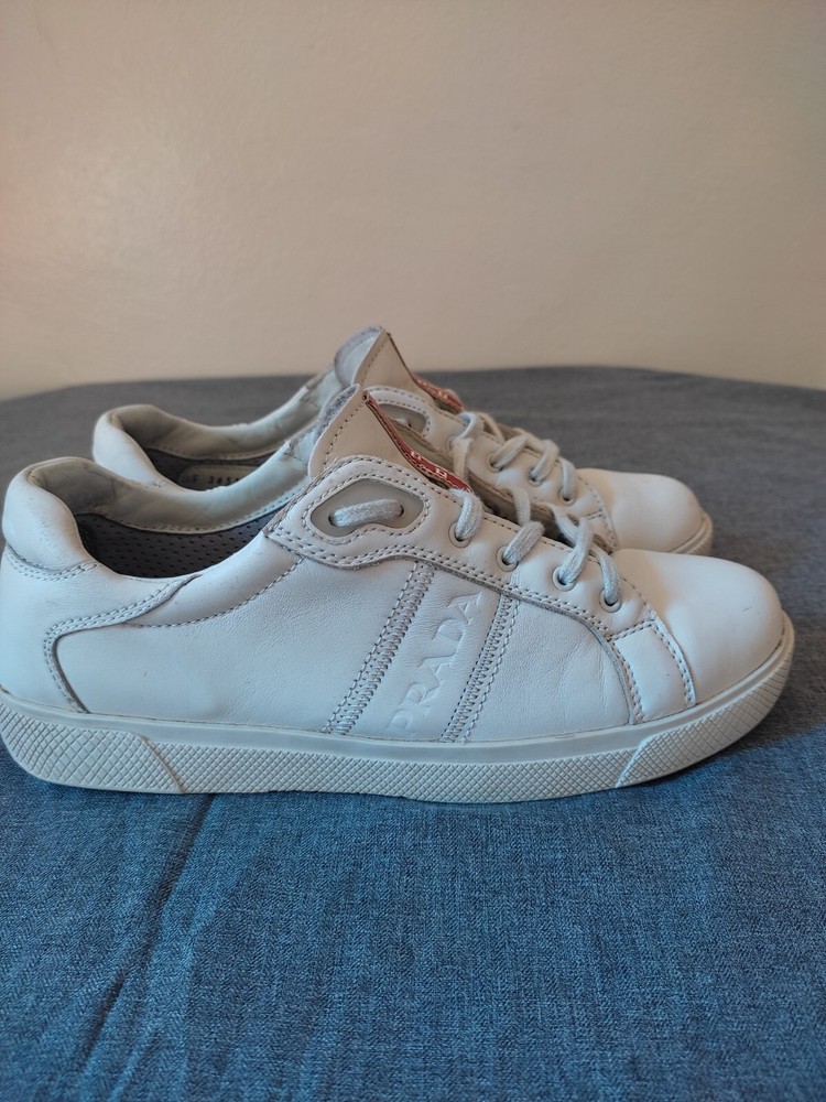 WELCOM Prada Low Top Sneakers White Leather Women Size 36.5 I try to be as honest as possible in my descriptions and will give full details of any faults that I find on the item With Pre-loved items, customers must accept that items will not be like new and may have some small marks, Colour fading or some pulls that may have happened with wear. We want customers to be aware of this when purchasing. Size 36.5 Please refer to pictures, FOR condition. We will gladly answer your questions prior making a purchase Please SEE the PICTURES AND size before buying shipping and handling 1. We ship to your eBay address Please make sure your eBay address is correct before you pay; 2. We ship within 2 business days after full payment is received and cleared. I do ship world wide by registered mail withe traking number Shipping time takes up to : =EXPEDITED 4/8 BUSINESS DAYS 65 $ ) recommend it) =Standard 11/25 BUSINESS DAYS 45 $ =ECONOMIC 25/35 BUSINESS DAYS 35 $ . + NOT RESPONSIBLE FOR CUSTOMS DUTIES ; taxes ;fees or delays.