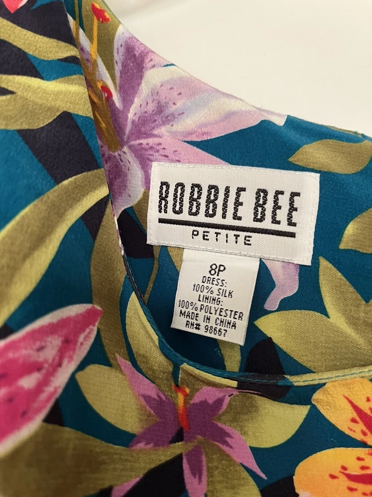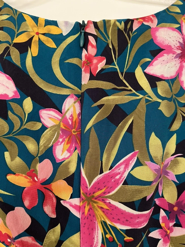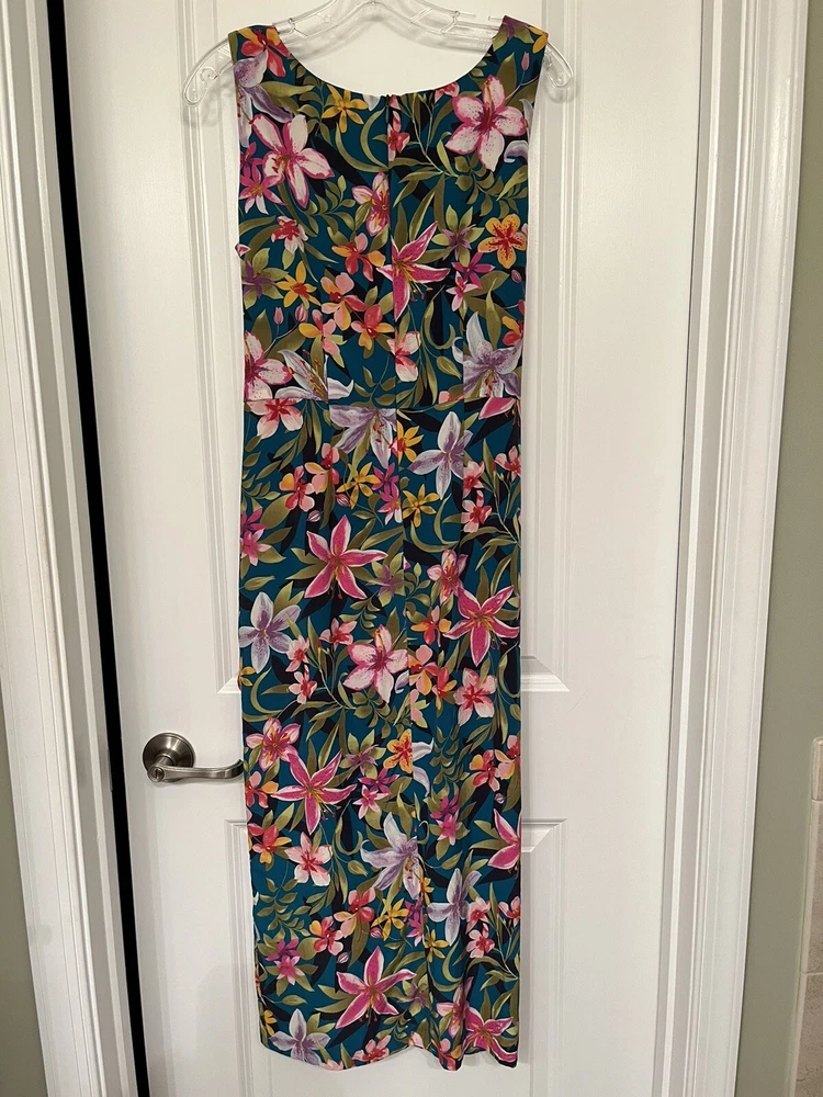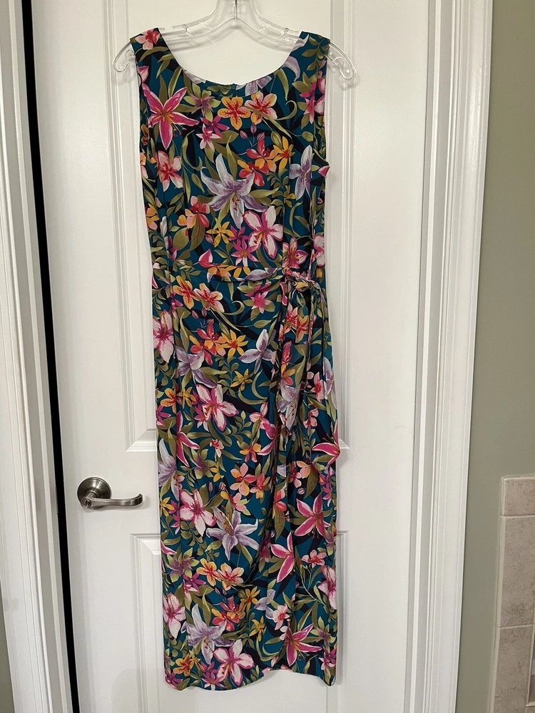 Gorgeous floral dress in size 8 petite. Sleeveless and comfortable. Self-tie bow accents waist. Unique zipper closure in back. Worn only once. From a smoke free home.