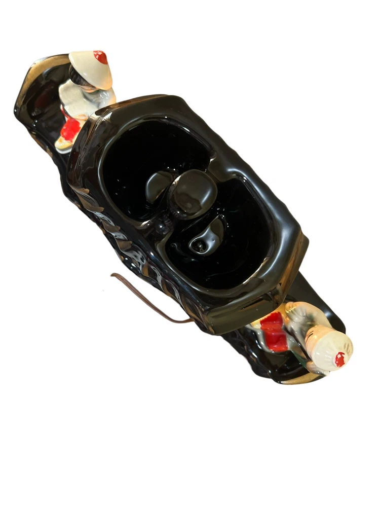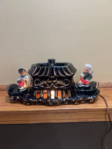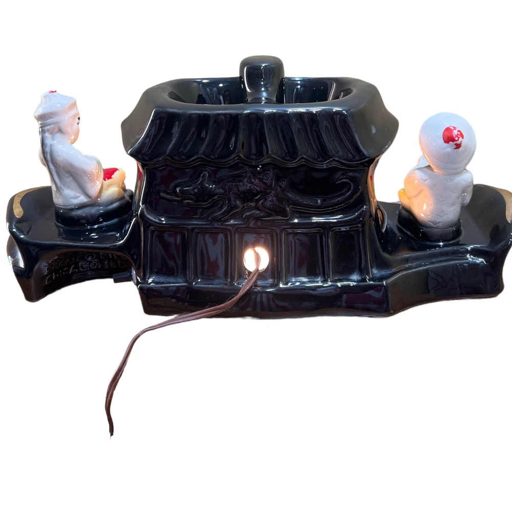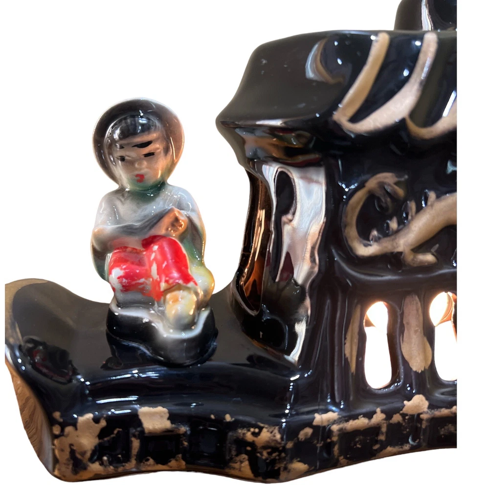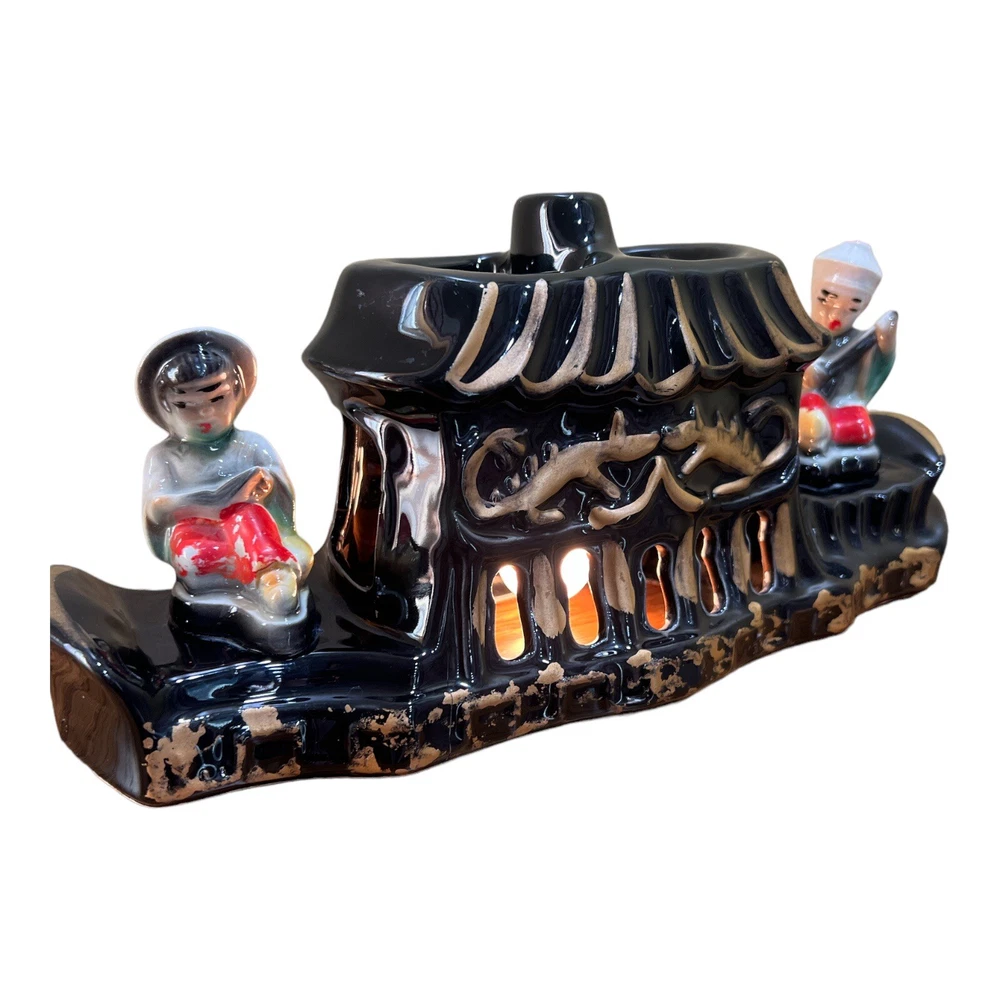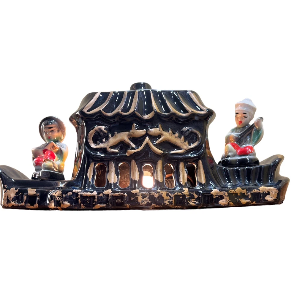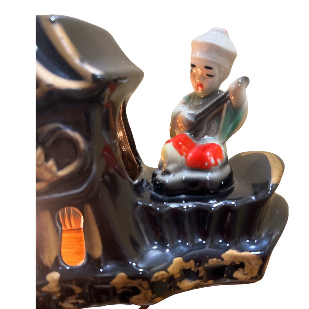 Premco Mfg. Co. Chicago Illinois 1954-55 Asian Pagoda Boat with Woman and Man Figurine Ceramic TV Lamp. Two Pronged Wall Plug In, On/Off Switch. Two Compartments On Top. Preowned. Condition Good. Few Hairline Cracks and One Paint Chip. Marked On Pictures. Smoke/Pet Free Environment. 30 Days Return. Buyer Pays Return Shipping. Refund Issued to Buyer After Receiving Item In Original Shipped Condition.