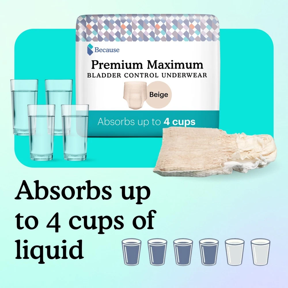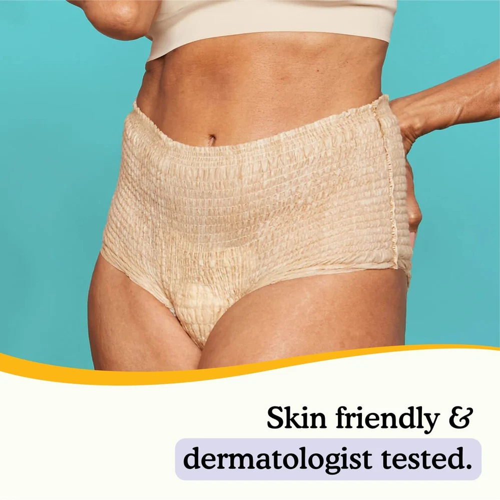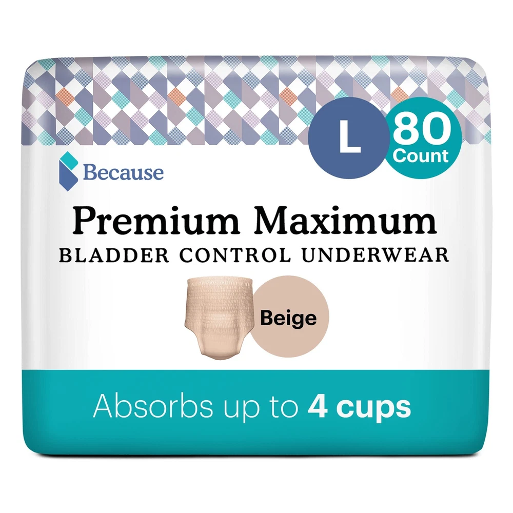 Maximum Absorbency Bladder Leak Underwear for Women, Large (38-50" waist), 80 pieces Heavy Absorbency in a Discreet Fit: Our maximum absorbency bladder leak incontinence underwear for women can absorb up to 4 cups of urine, making it a perfect choice for both daytime and nighttime incontinence. Leak-Proof Designs: Designed with a dual absorption core and reinforced leak guards, our heavy-duty, leakproof underwear for women keeps you feeling dry and fresh for up to 12 hours. Made with a Woman's Body in Mind: Tailored specifically for a woman's body, this incontinence pull-up fits seamlessly over the body's curves and moves naturally to prevent leaks. Sleek, Streamlined, Discreet Fit: Say goodbye to traditional "adult diapers" with our sleek, streamlined silhouette designed to fit invisibly under clothes; our pull-ups for women provide dependable leak protection and are made to make you feel confident. FSA/HSA Eligible: Save money by taking advantage of FSA and HSA eligible products, including our Premium Maximum Plus Incontinence Underwear for Women, available in beige and black. Made in the USA: Support American-made products with our exclusive line of Made in the USA incontinence and bladder leak protection solutions. High Quality Materials for Your Sensitive Skin: Made with only the highest quality materials, these incontinence pull-ups are latex-free, paraben-free, fragrance-free, PFAS-free, chlorine-free, and hypoallergenic. Stay Fresh and Odor-Free for Longer: Stay fresh longer with our dual absorption core and moisture-wicking top layer, which work together to keep skin dry and odors locked away for up to 12 hours. Great Fit for Postpartum Bladder Leaks: Capable of handling moderate to heavy postpartum bladder leaks without the bulky size of traditional postpartum "diapers"