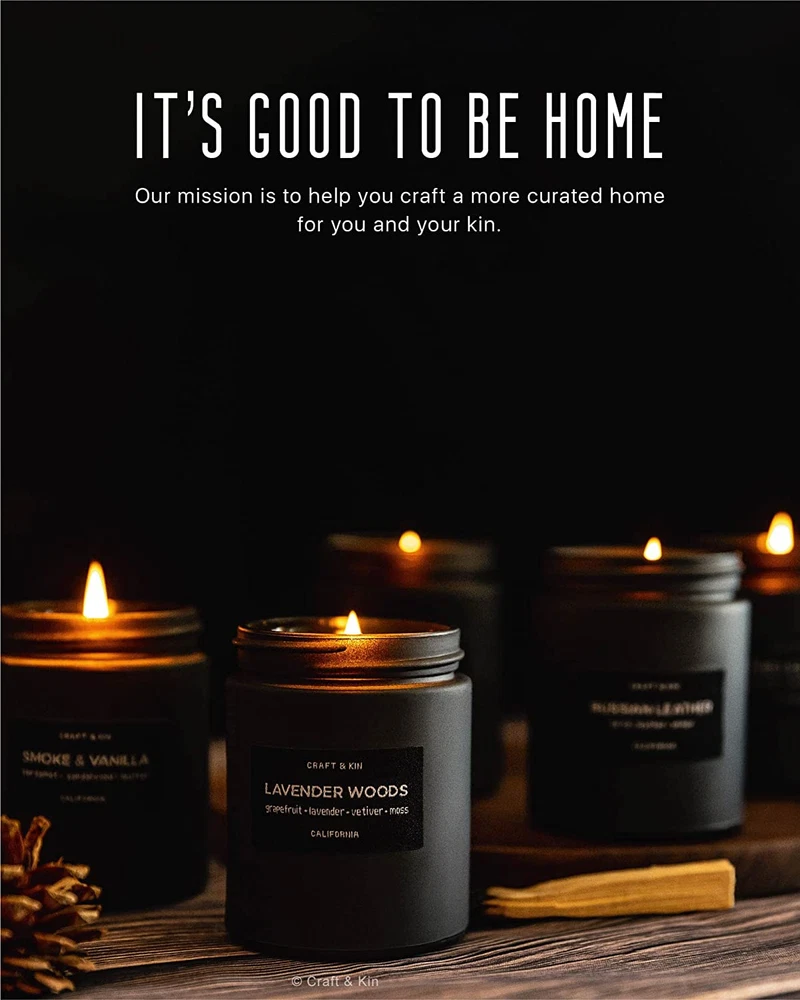 MASCULINE ELEGANCE: Immerse yourself in the magical allure of our fall scented candles crafted specifically for men. Designed to capture the essence of the season and the cozy warmth of masculine charm, these candles are an irresistible delight. Perfect for those who savor luxury and the comforting scents of the season, each gift comes in captivating, ready-to-give packaging. Elevate your gift-giving experience with this thoughtful and unforgettable present for any man deserving of a touch of elegance. PREMIUM SOY CANDLE: These 100% natural soy wax, wood wick fall candles are safe to use and long-burning. This Fireside aromatherapy candle for home is made with essential oils that bring you a strong masculine fragrance to your home. CANDLE FOR MEN: Have you looked for a candle for men for a long time? We’ve designed the perfect one for you and your loved ones. It comes with a strong masculine scent and a stylish black design. LONG LASTING SCENT: This 7.6 oz scented candle will bring in the masculine notes of cedar, smoke, patchouli, and vetiver to your home. Enjoy this luxury candle made with the finest essential oils to bring you a lasting and strong scent. OUR MISSION: The Craft & Kin Collection is carefully designed and crafted with your home and family in mind. We believe that your home should be a collection of people and things you love. Our mission is to help you craft a little more of that love with your kin. Product Description Aromatherapy candle These soy candles are made with strong essential oils that will create an enjoyable ambiance in your home. 100% Natural Soy Wax Each candle is made with 100% premium soy wax. Strong Essential Oils A highly scented candle made with a blend of essential oil mixtures. Wood Wick Featuring a wood wick for the ultimate "fireplace"-like atmosphere. Elegant Packaging Our scented candles come in a giftable black box for the ultimate experience. 1 100% Natural Soy Wax 2 Strong Essential Oils 3 Wood Wick 4 Elegant Packaging Fireside Featuring the masculine notes of cedar, smoke, patchouli, and vetiver. Lavender Woods The mystical notes of grapefruit, lavender, vetiver, and moss. Pine & Clove Woodsy pine, musk, oakmoss, and clove mix together in this earthy scent. Smoke & Vanilla Bergamot, sandalwood, leather, and vanilla meet to form this unique blend. Vintage Leather A blend of birch, amber, Vintage leather, and cedarwood. 1 Fireside 2 Lavender Woods 3 Pine & Clove 4 Smoke & Vanilla 5 Vintage Leather