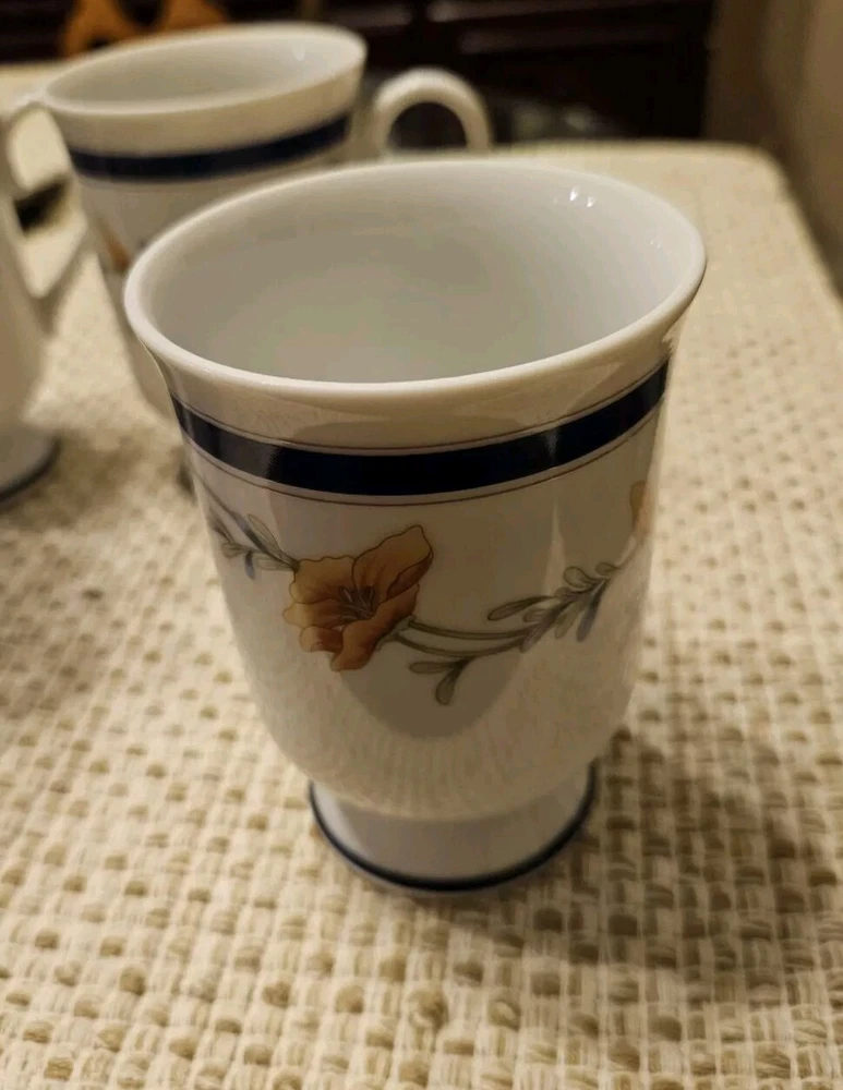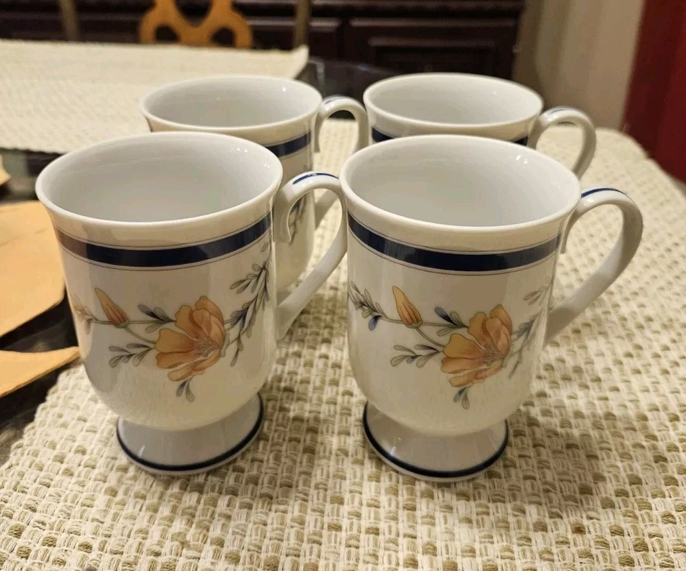 Add a touch of elegance to your mornings with this set of 4 Princess House porcelain mugs featuring the beautiful California Poppies pattern. Made in Japan, these mugs are of the highest quality and are sure to impress. Perfect for your daily coffee or tea, these coffee cups are a must-have for any collector of fine porcelain. The brand, Princess House, is known for their exquisite designs and attention to detail, making these mugs a true gem. Bring a piece of California into your home with these stunning mugs. Each cup measures approximately 4 1/2" tall x 3" wide. No cracks or chips. Follow me for more items for sale.