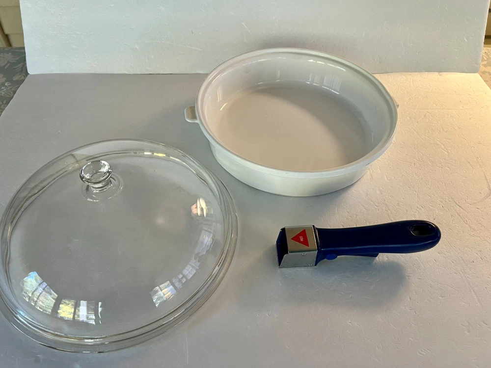 This Princess House Nouveau skillet/casserole comes in a pristine white color with a lid and detachable handle. It is perfect for cooking and serving your favorite dishes. The skillet is made of high-quality materials and features a unique design that will add a touch of elegance to your kitchen. The detachable handle makes it easy to store and transport the skillet, while the lid helps to retain heat and nutrients. Whether you're cooking up a storm or serving a formal dinner, this Princess House Nouveau skillet/casserole is a must-have for any home chef. ***In excellent “like new” condition!