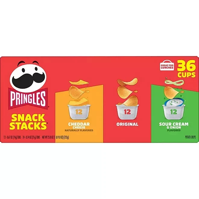 Pringles Variety Pack β 3 Flavors β Original, Cheddar Cheese & Sour Cream & Onion β 12 Single-Serve Cups β Crispy Potato Snacks π₯ Three Bold, Crave-Worthy Flavors in One Pack Enjoy the classic crunch of Pringles Potato Crisps in a variety of your favorite flavors! This variety pack includes individual cups of: β Original β Lightly salted, classic taste β Cheddar Cheese β Rich, cheesy goodness β Sour Cream & Onion β A zesty, savory favorite π Light, Crispy & Never Greasy Each chip delivers that signature Pringles crunch with bold, salty flavor in every bite. These single-serve cups are the perfect way to satisfy your snack cravingsβ anytime, anywhere . π Perfect Grab-and-Go Snacks These conveniently sized, portable snack cups are ideal for: School lunches & after-school snacks Road trips, travel, and on-the-go munching Office snack drawers or midday work breaks Parties, BBQs, and game-day snacks π Great for Sharing & Snacking Keep your pantry stocked with this fun, flavorful variety pack. Whether youβre sharing with friends or enjoying solo, Pringles Cups are the perfect snack to keep you coming backβ stack after stack . Product Details: Brand: Pringles Product Type: Potato Crisps Flavors Included: Original, Cheddar Cheese, Sour Cream & Onion Pack Size: 12 Single-Serve Cups Packaging: Sealed individual cups for freshness Stock up on this snack-time favorite and enjoy irresistible flavor on the go with Pringles Variety Pack!