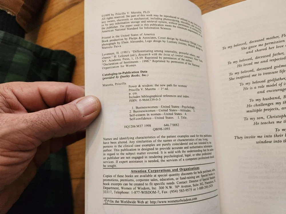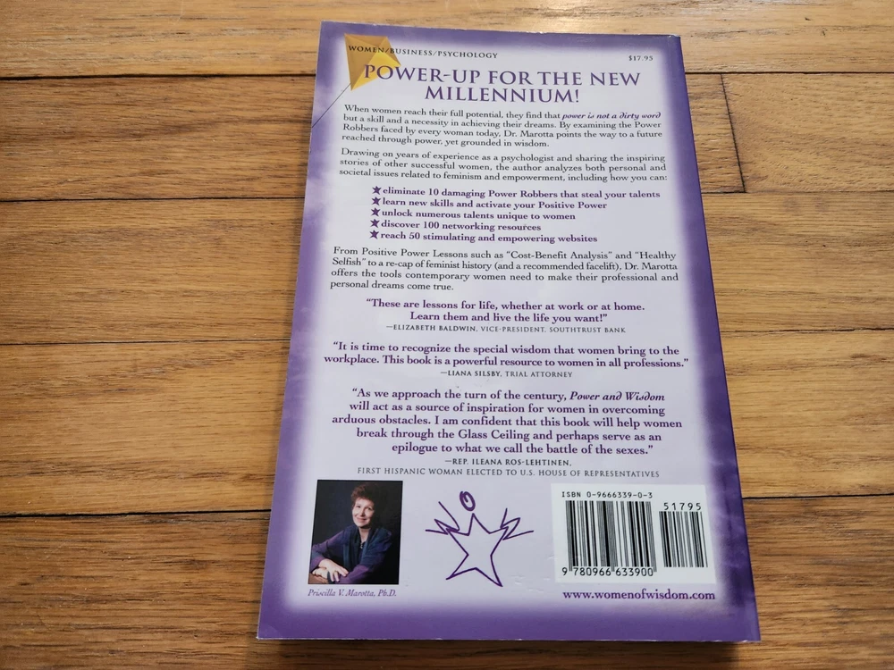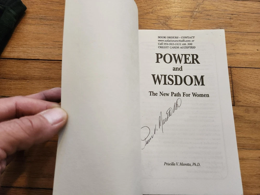 Priscilla Marotta Ph.D. SIGNED Power and Wisdom Women Self-Help 1999 1st Ed. GOA Up for bids is this 1999 first edition soft cover version of Power and Wisdom: The New Path For Women, which was written AND signed by Priscilla Marotta Ph.D. and is in GOOD condition (CLose to VERY GOOD; NOT a library book; NO reminder marks; NO punch holes). Guarantee of Authenticity (GOA) – We guarantee the authenticity of our SIGNED books and sports memorabilia, all of which have passed a rigorous 20-step authentication process used by forensic autograph analysts. We are so confident in our process that IF one of our SIGNED items fails authentication via Beckett, PSA or CGC, EJay Collectibles will provide you with a full refund plus an additional $10 to help offset the expensive authentication process. Pat Moran, recognized by Working Women magazine, as CEO of the largest women-owned business introduces Power and Wisdom, a captivating book that teaches women that power is not a dirty word, identifies power robbers, and presents a step-by-step guide for women to develop positive power skills needed to make their professional and personal dreams come true. Dr. Marotta points the way to a future, beyond the Glass Ceiling, grounded in wisdom. Directories of networking resources and stimulating websites included.