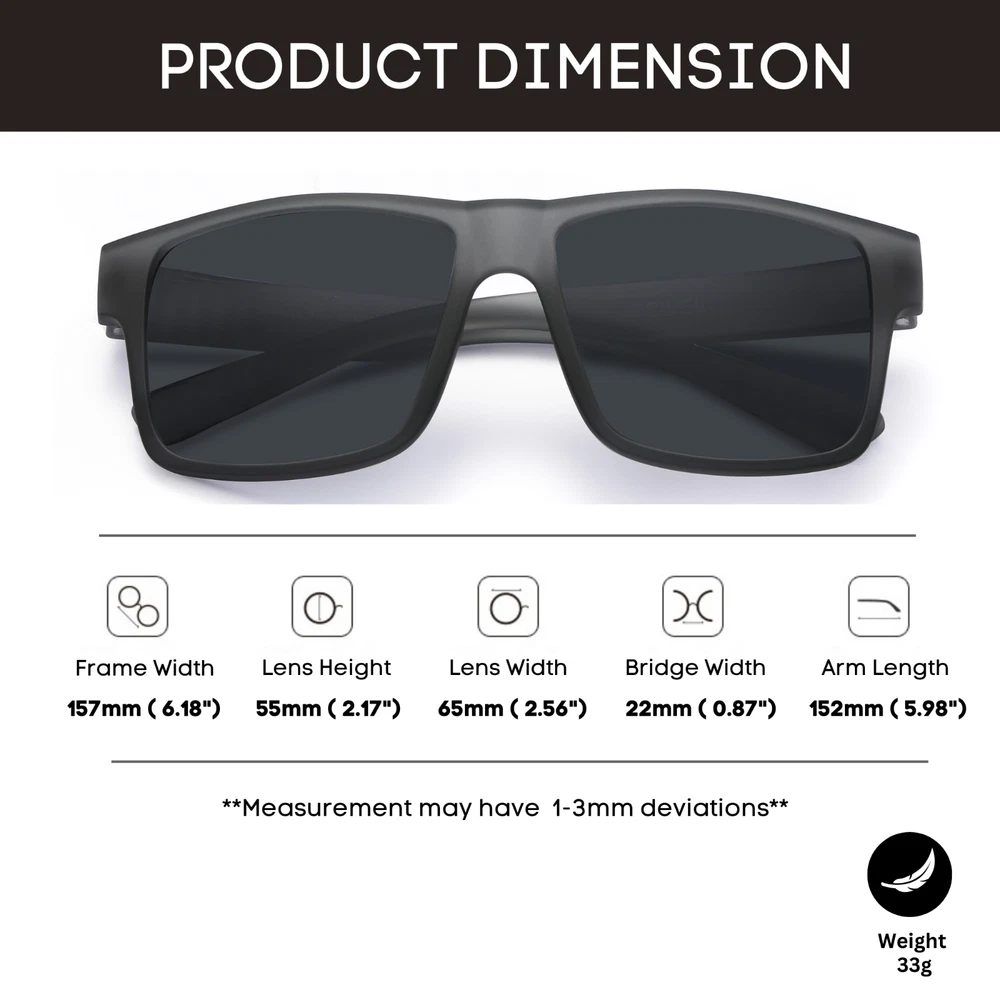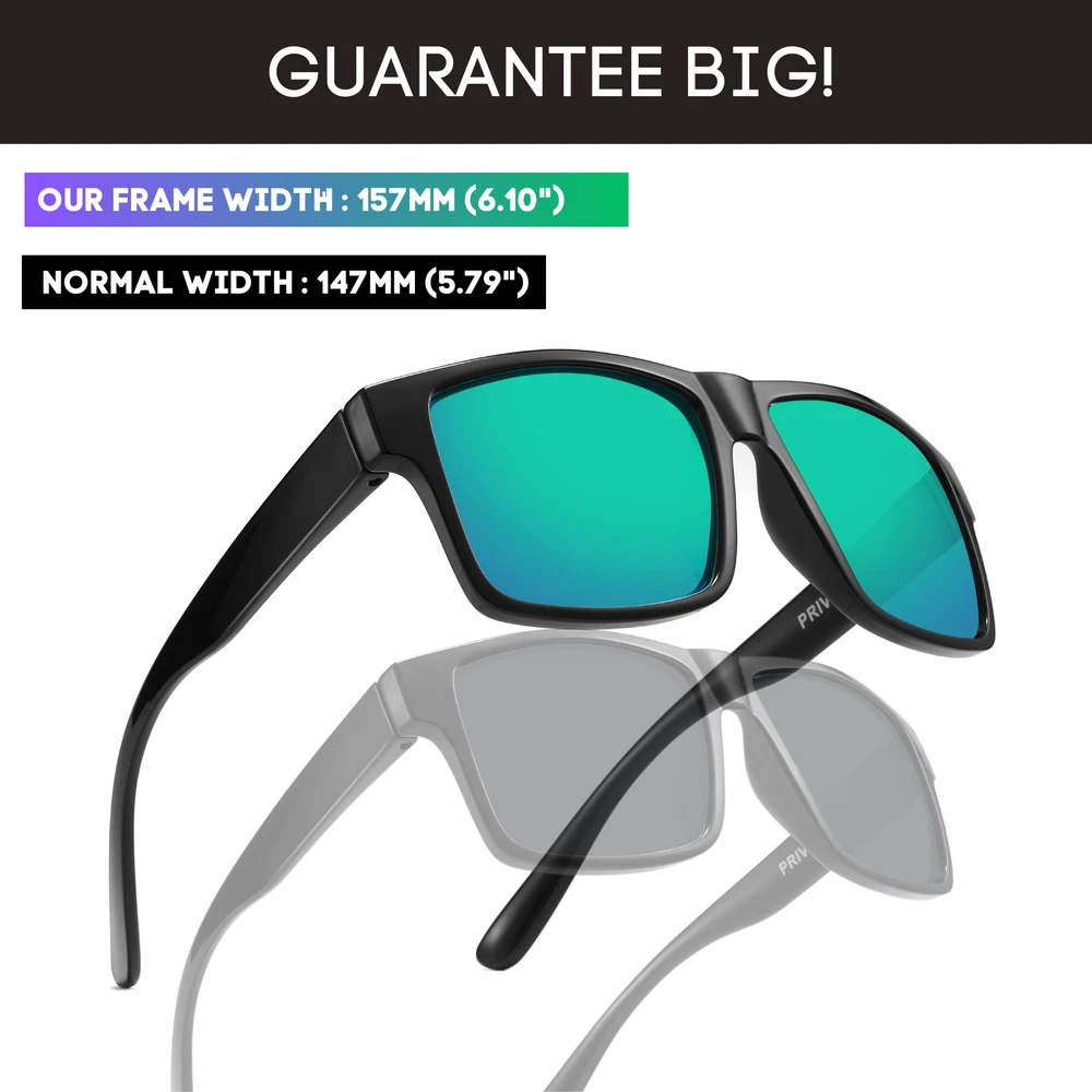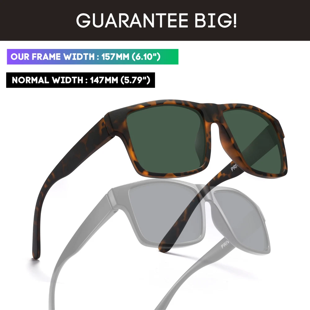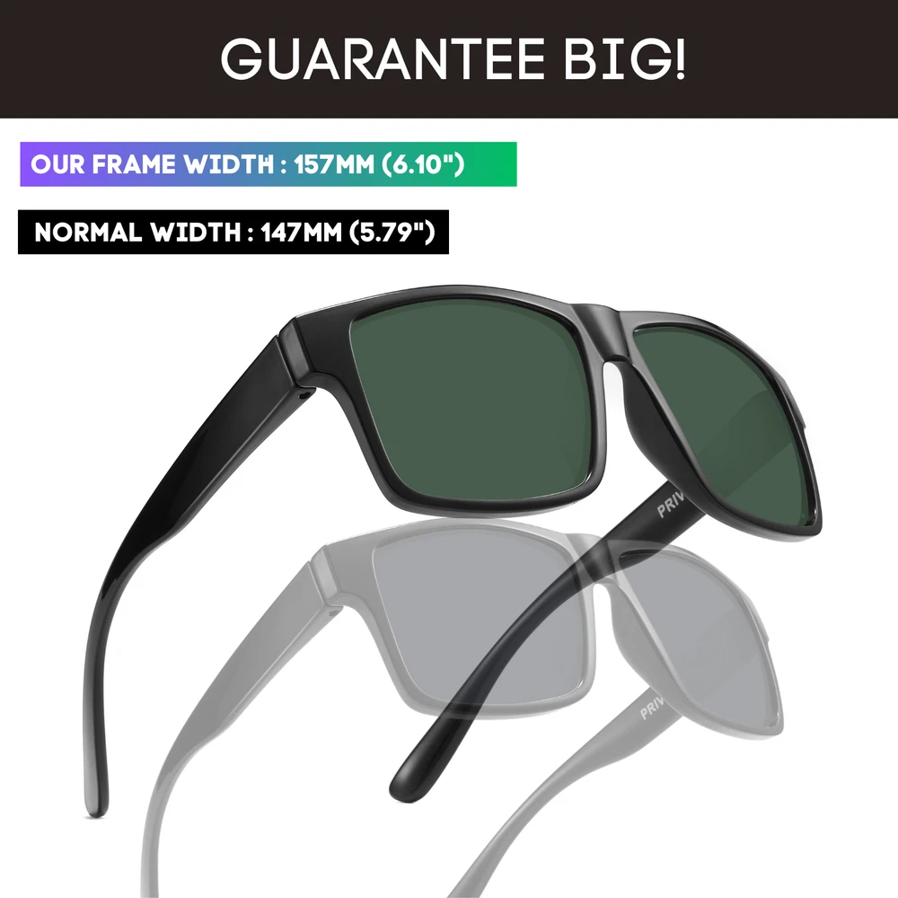 Product Features [Guarantee Big] - You've tried everything on the market but all of the sunglasses are still a little small. If there is one thing that makes our sunglasses stand out from the rest, it's the fact that they fit you perfectly. No more dealing with head pinches, no more feeling uncomfortable and ridiculous in small shades, no more wishing for sunglasses that fit you! [Polarized Lenses] - Our TAC polarized lenses offer clear vision on bright days, reduce glare and reflection, filter out 99.99% of UVA & UVB rays, and provide increased contrast with minimal color distortion. They are perfect for outdoor activities such as fishing, hiking, driving, or spending time at the beach, while keeping your eyes healthy and clear. [TR90 Frame] - The TR90 frame is made of thermoplastic materials that are both durable and flexible, yet lightweight compared to typical plastic frames. This flexibility makes it highly resilient to damage and less likely to break or bend from impact. Additionally, the frame is ultra-lightweight, allowing for comfortable and long-lasting wear. [Product Dimension] - Frame Width : 157mm (6.18") | Lens Height : 55mm (2.17") | Lens Width : 65mm (2.56") | Bridge Width : 22mm (0.87") | Temple Length: 152mm (5.98") [30 Day Money Back] - We're dedicated to providing amazing products that resonate with you at honest prices. Our customers are covered by a 30-day money-back guarantee. If, for any reason, the purchase is unsatisfactory, customers can return the unit and receive a refund. Trying our products comes with no risk, and we're committed to providing you with the best possible service.