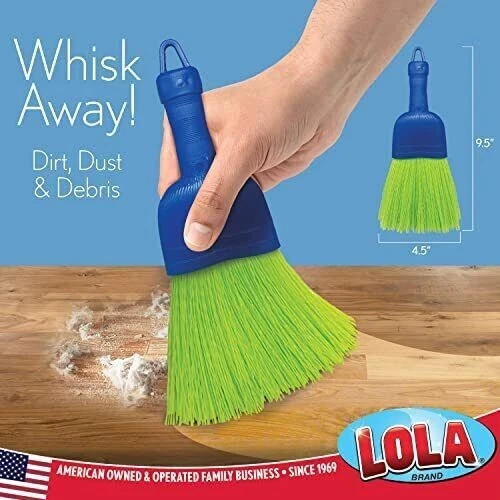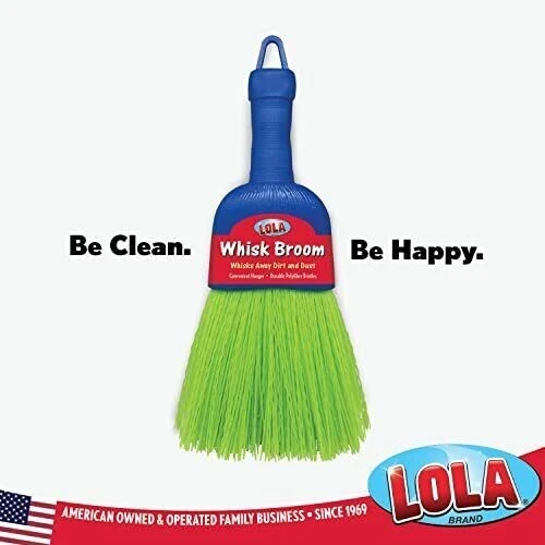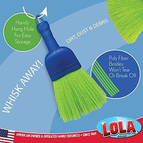 Products Whisk Broom | Handheld Brush | Durable Poly Fiber & Nylon Bristle | Whisks Away Dirt & Dust | 9.5"L & 4"W Brush Head W/ Hang Hole For Easy Storage | Great For Indoor Or Outdoor Cleaning HIGH-QUALITY MATERIAL - Lola's handheld whisk broom is made from durable poly fiber bristle, this bristle brush fibers don't tear or break off leaving a mess. It will last for many years of cleaning LARGE BRUSH HEAD - Lola's handheld whisk broom has a brush head that measures 9.5" long and 4" wide. It whisks away dirt and debris. VERSATILE – This whisk broom can be used for indoor or outdoor cleaning. Easy hang hole makes storage a breeze. Nylon bristles make for easy clean-up. RINSES CLEAN IN WATER - For such an effective easy clean, cleaning it is so easy! Simply rinse the fibers with cool water to clean.