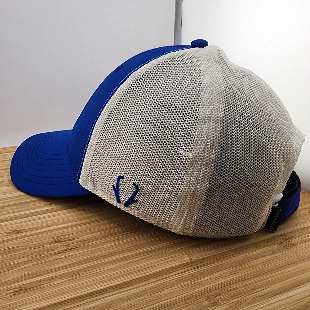 This Imperial golf hat is perfect for any casual occasion. The blue and white color scheme, featuring a solid pattern and the character Pronghorn, adds a touch of style to any outfit. The hat is made of lightweight polyester material, with a mesh back for breathability and moisture-wicking technology to keep you cool and dry. The hook and loop strapback ensures a comfortable and adjustable fit for all head sizes. This unisex hat is suitable for winter, summer, fall, and spring seasons. Whether you're playing a round of golf or just out for a walk, this hat is the perfect accessory to complete your look.