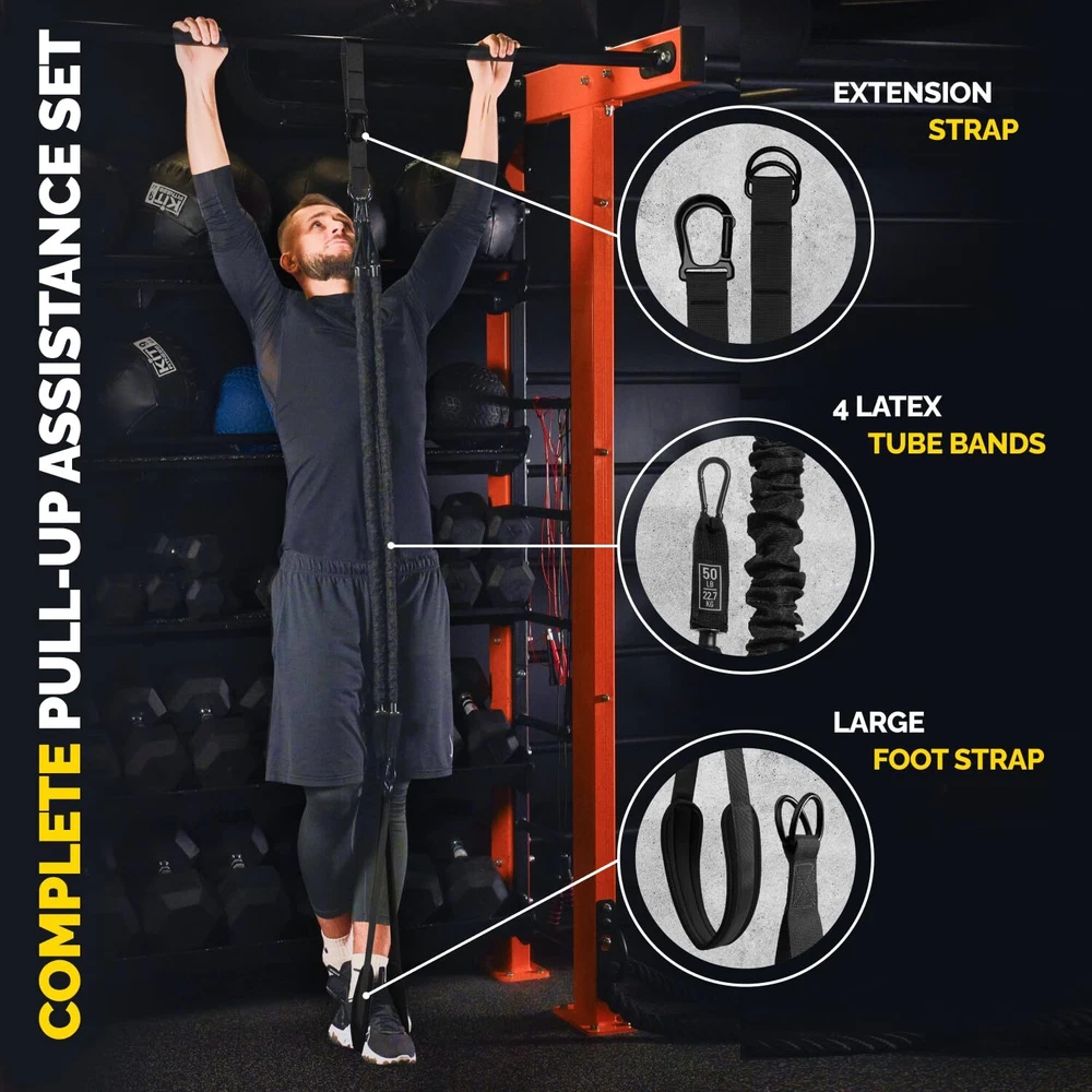 [Tailored Pullup Bands] With 4 pull up bar resistance bands, each providing 50lb of tension, you can scale from 50lb to 200lb of assistance. Whether you're a beginner or advancing, these pull-up assist bands adapt to your strength level [Height Adjustable] The pull up bands assistance bands feature an adjustable strap, ensuring a just-right fit for any user. Convenience meets customization, these pull up bar bands help you achieve the perfect pullup, whether you're short or tall [Safety & Durability] Each one of the pullup assist bands is encased in a durable nylon sleeve, enhancing safety and extending the lifespan of your gear. Train with confidence, knowing your pull up straps are designed for both durability and security [Easy Setup] Effortlessness is key with our resistance bands pull up assist. Setting up the pull-up assist bands is a breeze in just 3 easy steps, thanks to the intuitive design. It’s your time to focus on your pull-ups, not a complicated setup [Superior Quality Pull Up Bar Accessories] Constructed with robust materials, our pull up bar bands assistance bands feature double metal rings and foot cushioning for maximum comfort and longevity, embodying top-tier standards for serious athletes