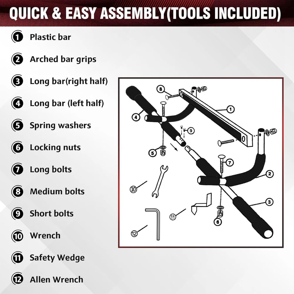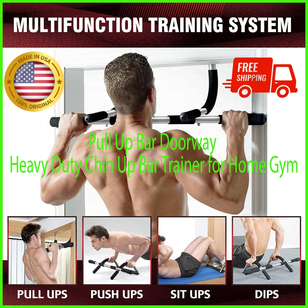 Pull Up Bar Doorway Heavy Duty Chin Up Bar Trainer for Home Gym About this item MULTIFUNCTIONAL EXERCISE BAR - This pull up bar for doorway not only provides pull-ups but also enables wide-grip push-ups, sit-ups, arm and shoulder exercises, helping you achieve a variety of workouts for a strong upper body. It replaces multiple devices, making it a versatile addition to your home gym. EASY TO INSTALL - The pull up bar for doorway comes with an assembly manual and tool, allowing for easy installation and removal. With a length of 36", it fits standard doorways ranging from 23" to 31" wide and 4.7" to 7.5" deep. It uses a lever to attach securely, requiring no drilling and ensuring your door remains undamaged. DOOR FRAME PROTECTION - The top of this pull-up bar is equipped with thickened foam to protect the door frame from damage, and the outside and inside of the pullup bar are equipped with foam handles, which can effectively prevent damage to both sides of the door frame PREMIUM MATERIALS - This door pull up bar is constructed of heavy duty steel for its sturdiness and stability, and the top square steel has thick foam stripes for wall protection. The handle is equipped with ergonomic comfort foam for a comfortable grip, non-slip and wear-resistant, adding stability and preventing the door frame from being scratched or damaged UPGRADE PULL UP BAR - Our door frame horizontal bar has been upgraded, and the thickness of the horizontal bar is now 1.7mm, which makes it more load-bearing, max capacity is 440lbs. Additionally, two screws are installed in the middle of the horizontal bar to fix it, solving the problem of loose horizontal bars and enhancing its stability RETURN OR REPLACE SERVICE - We are located in Houston, Texas and speak to customers daily. If at anytime you have an issue with our product, tell us immediately and we will help out