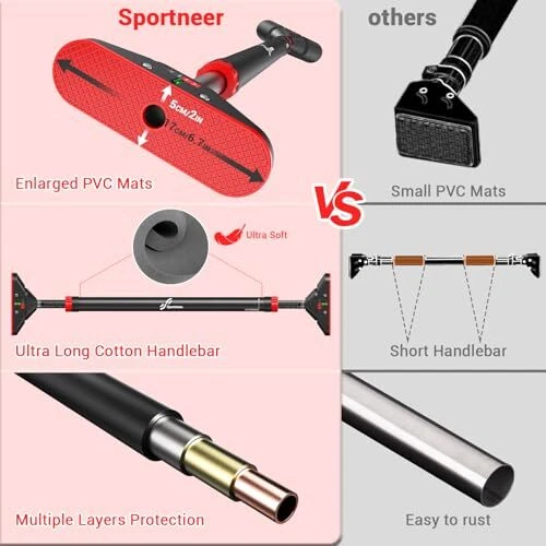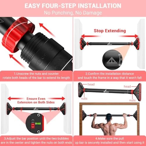 Return Policy Fast Delivery Trusted seller Pull Up Bar for Doorway: Strength Training Pull-up Bars without Screw - Adjustable Width Locking Mechanism Chin Up Bar, Thickened Steel Max Limit 440 lbs Upper Body Fitness Pullup Bars for Home (Black-Red) Product Description Before purchg, please make sure that the size of your door frame is 29.5 in-37 in (75 cm-94 cm). This Chin up Bar is not suitable for door frame widths outside this range; The width of the door frame must be wider than the width of the anti-slip pads at both ends of the pull up bar To ensure safety, the manual specifies a maximum load of 297 lbs (135 kg). Testing shows the product can handle up to 744 lbs (337.5 kg) of instantaneous load, meeting a 2.5x safety factor. However, the pull up bar's capacity also depends on the usage environment. Users should strictly ad to the 135 kg limit No Drilling, No Traces: The pull-up bar uses innovative fixative technology to stay in place. It features two large 6.5 x 1.8-inch PVC mats for added friction and stability. Four metal fixed points connect the base and bar, ensuring a secure, fall-proof design even under heavy loads Heavy Duty Construction: Our Pull Up Bar supports up to 440 lbs (200 kg) with its 2 mm outer and 1.5 mm inner steel pipes. This pull-up bar built to last without deforming or breaking, ensuring durability for your home gym. Note: Longer use distances may reduce the load of chin-up bar Upgraded Mechanic Lock System: This push-up bar features a new 360-degree rotatable dual gear lock on both ends to protect the bar from loosening. The doorway exercise bar has passed extensive testing, ensuring safety and sturdiness for confident use Easy Installation: Install quickly with detailed instructions, a video guide, and arrow markers on the chin-up bar. Spirit levels on both ends ensure correct setup. Ensure your doorway or wall is solid; avoid ceramic tiles, glass or non-solid doorframe. Note: Verify the marked rotation direction; reversing it may cause locking Integrated, Extensible Structure: Unlike most 2-section foam bars, this doorway pull up bar features an ultra long, integrated anti-slip cotton handlebar for a flexible grip. It's sweat-resistant, odorless, and durable. Twist the bar to adjust its length from 29.5 to 37 inches (75 to 94 cm) for various workouts like pull-ups, sit-ups, push-ups, stretching and more Shipping Returns Payment Shipping Shipping is FREE to all addresses other than APO/PO boxes in the lower 48 states. All our stock ships from US-based warehouses. Shipped via USPS or UPS (depending on location and package weight) Unless stated otherwise, all orders will ship within 24-72 hours of your payment being processed. Check our feedback to see the great reviews of FAST shipping we offer. Returns Seller does not accept returns Payment We currently accept payment via eBay managed payments only. Once payment is cleared, we will dispatch your shipment within 1-3 business days. Please refer to the "Shipping" tab for more information regarding shipping speed to your destination.