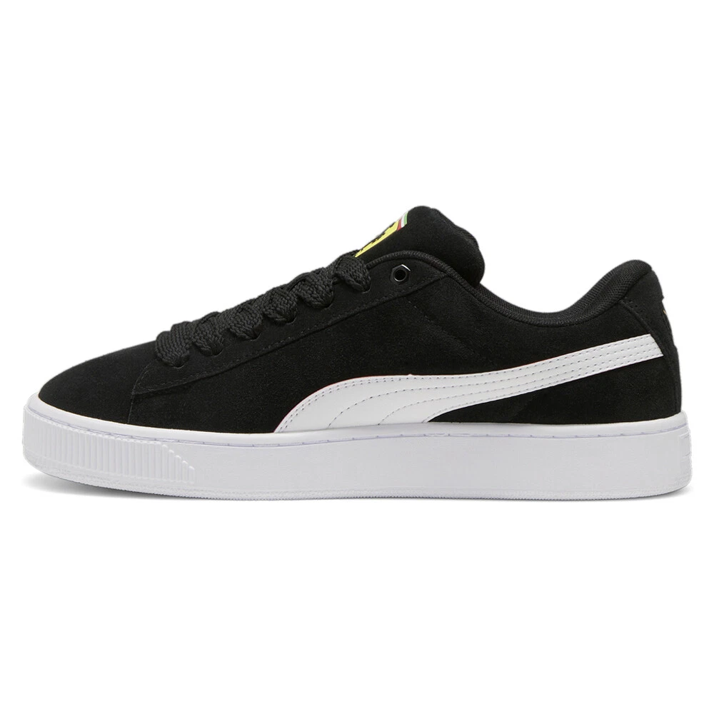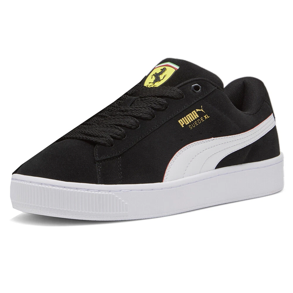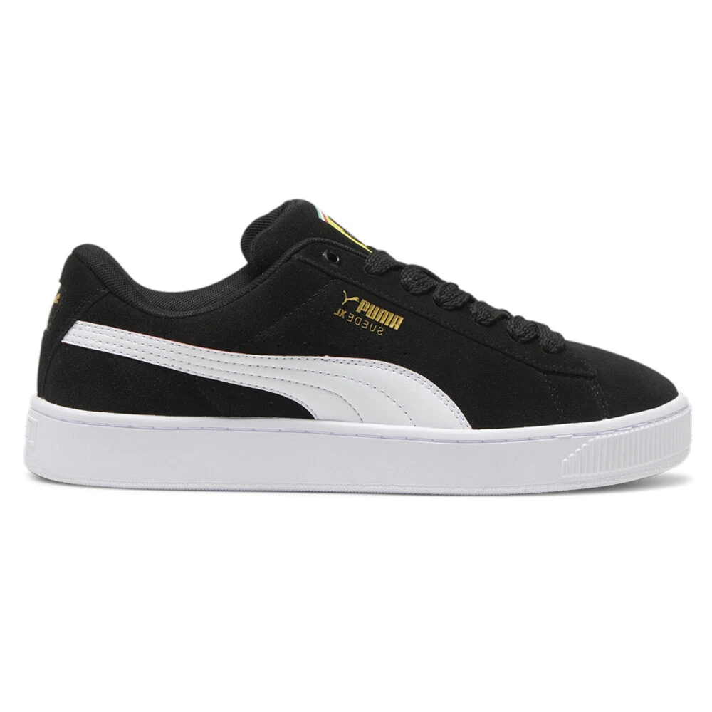 SF Suede XL Lace Up Sneakers Product Details Suede upper Leather formstrip Mesh lining Mesh sockliner Rubber sole This fresh take on the classic Suede draws inspiration from Puma’s heritage within breakdancing and its influence on modern streetwear. The Suede XL retains the Suede’s iconic DNA, but gives it a twist with an exaggerated padded collar and tongue, plus a chunkier sole. This execution celebrates SF and features the colors and insignia from the racing legends. Additional Details Color: Black Occasion: Casual Gender: Mens Age: Adult Brand: Puma