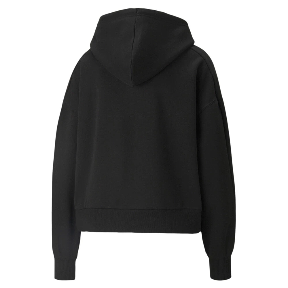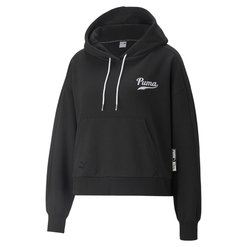 Team Pullover Hoodie Product Details Wide oversized fit Pullover entry Kangaroo pocket 66% cotton, 34% polyester The wide, roomy fit and adjustable hood provide warmth and maximum comfort. A large kangaroo pocket is convenient for stowage, and PUMA Team retro detail embroidery adds a vintage feel to the casual look. By purchasing cotton from PUMA, you support more sustainable cotton farming through the Better Cotton Initiative. Additional Details Color: Black Occasion: Casual Gender: Womens Age: Adult Brand: Puma