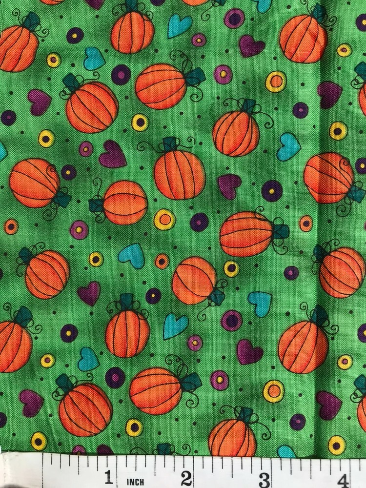 Pumpkin Patch Bright on Green Quilt Fabric This piece is cut from top quality 100% cotton fabric. Click image to view larger version Mix this fabric with others we have on auction and in our eBay Store now! This fabric has not been pre-washed NOTE : This fat quarter measures 18" x 22". SAVE SHIPPING COSTS!! I will be happy to combine auction wins to reduce your shipping costs. Please check out my other auctions and my online store. Thanks for looking. Visit my eBay Store: CatHouse Quilts & Fabrics Add to Favorite Stores View more great items