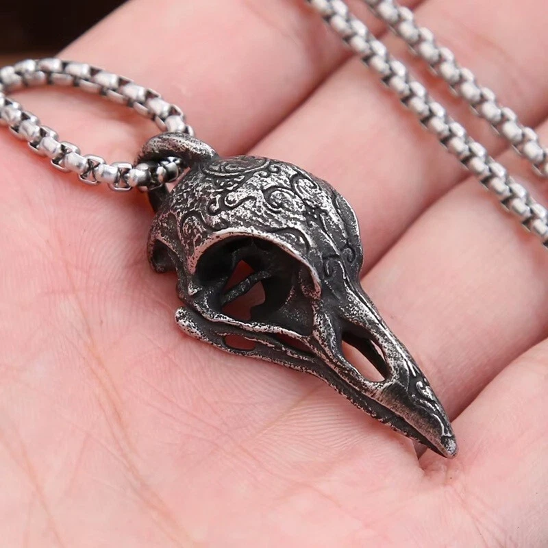 Punk Viking Stainless Steel Crow Skull Pendant Vintage Small Size Nordic Mens Necklace Biker Amulet Jewelry Gift Style: Punk/Hip-Hop/High Street/Fashion Jewelry Pendant size: 40*25mm Chain length: 50/60/70cm Metal: High quality 316L stainless steel, strong and durable, healthy material, keep the color for a long time. Classic Pendant Necklace: The best gift option for both men and women. Packing: wear jewelry bag NOTE: The necklace pendant is made of stainless steel, not just electroplated, so don't worry about it fading.
