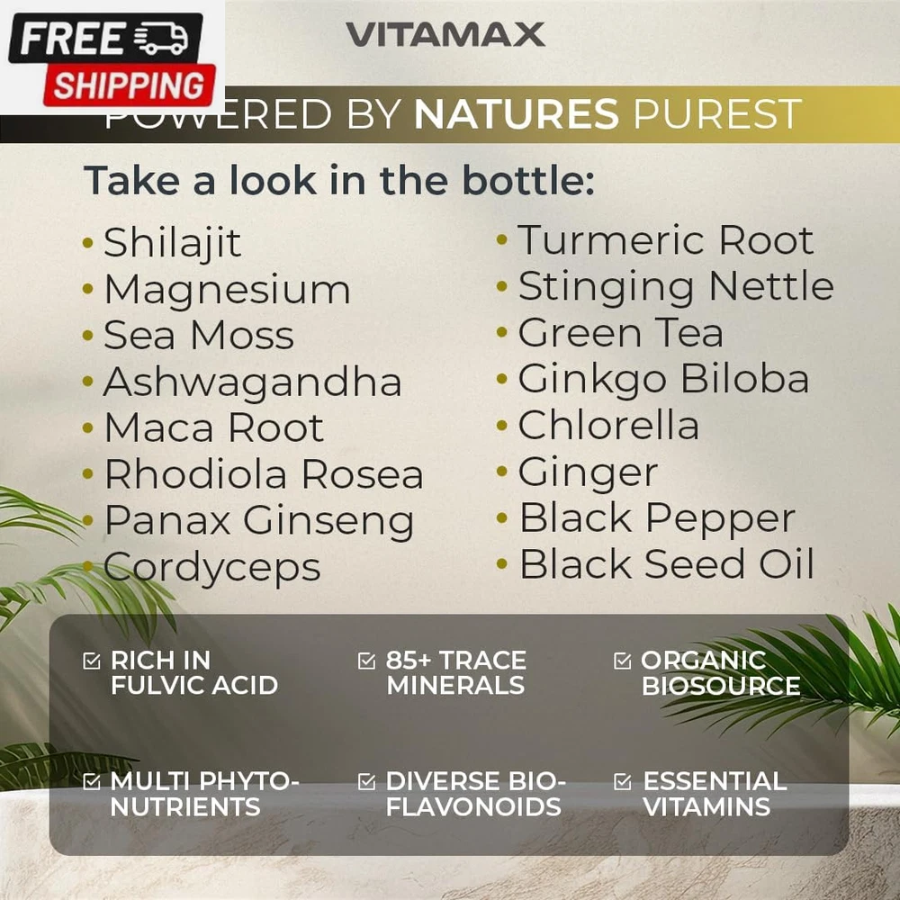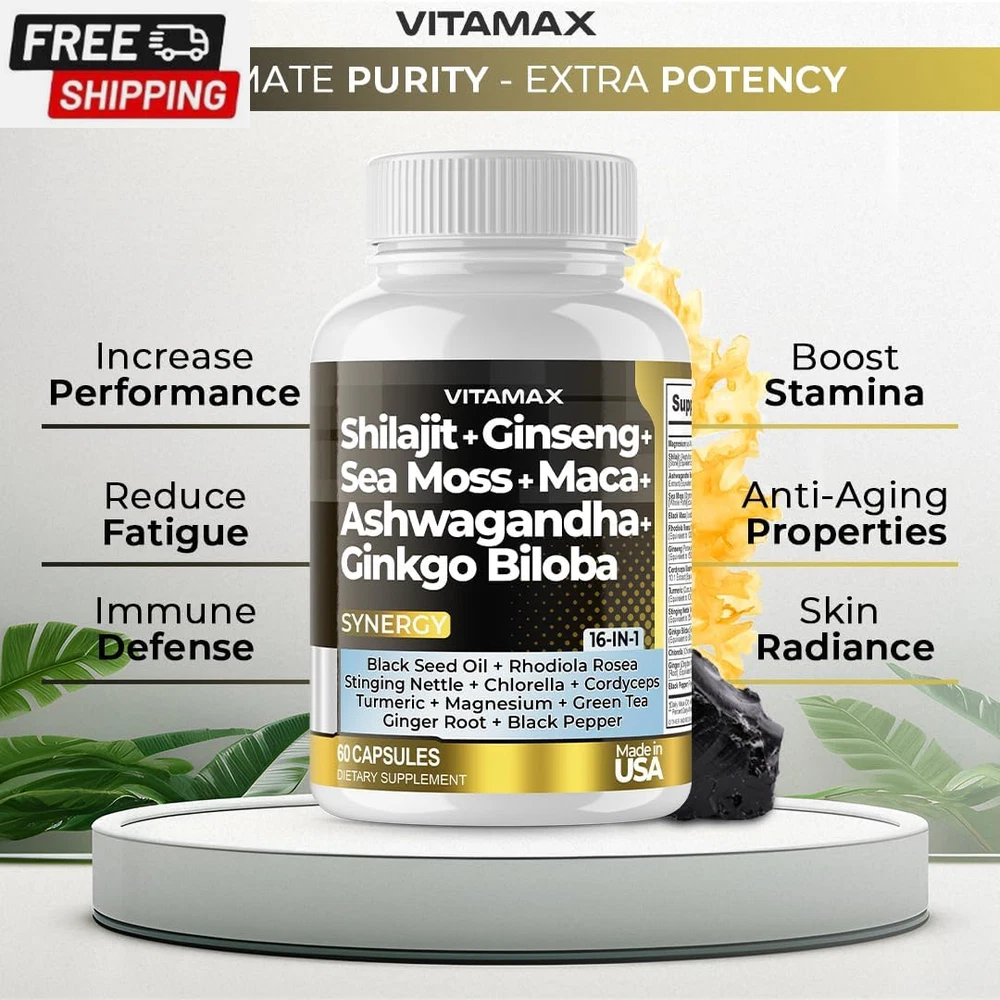 Pure Himalayan Shilajit Supplement 10,000Mg Ashwagandha 6,000Mg Sea Moss 2,000Mg Rhodiola Rosea 1000MG Gingko Biloba 500Mg Trace Mineral Capsules - Men and Women – Made in USA (60 Count (Pack of 1)) Rare Shilajit from 18,000ft: Unlike many other forms of Shiljajit, Vitamax's Nature's Synergy Shilajit is sourced from mountain peaks reaching 18,000ft, ensuring the purest and most potent grade Shilajit. Common in Ancient Ayurvedic traditions, Shilajit, combined with 15 other powerful ingredients, helps support our daily needs and enhances mineral absorption. Nature's Synergy Formula: Gold-grade Shilajit capsules, a Gilgit-Baltistan Himalayan Mountains marvel enriched with 80+ trace mineral supplements like iron, calcium, magnesium, zinc, and fulvic acid. Sea Moss, boasting 92 essential minerals and vitamins in one supplement, helps support our natural immune system and energy levels. Advanced Shilajit Capsules: For men and women. Pure organic shilajit is a centuries-old treasure from the Himalayas that nourishes our mind and body with rare and essential minerals and fulvic acid. This elixir of vitality, paired with Ginkgo Biloba, Rhodiola Rosea, Ashwagandha Extract, Panax Ginseng Extract, Stinging Nettle, Cordyceps Mushroom, and Turmeric, offers a vitalizing boost to our body's natural healing process. Trusted Quality: Quality is our utmost priority. Our supplements undergo rigorous third-party lab testing in the USA, ensuring premium quality and purity. Formulated meticulously in a GMP-certified facility, our capsules contain no unnecessary preservatives or fillers. They are always made in the USA. Product Description Shipping Fast shipping is very important for us. Our standard US shipping service is FREE. Your order will be shipped within 2-3 business days upon full payment received. Your order will be delivered within 2-3 business days after the handling time. We only ship to the confirmed PayPal address. We reserve the right to cancel any order for any reason at any time. We are not responsible for undeliverable addresses. Returns and payment We offer a 30 days return policy from checkout winning date. We allow only PayPal as payment method FeedBack Your feedback very important to us, after you get your package and you are satisfied with our service please leave us positive feedback If you have any problem with your order / any questions please before leave any type of feedback For any questions, using eBay contact system Please visit our eBay store to check out other items for sale! Thank you for shopping at our store.