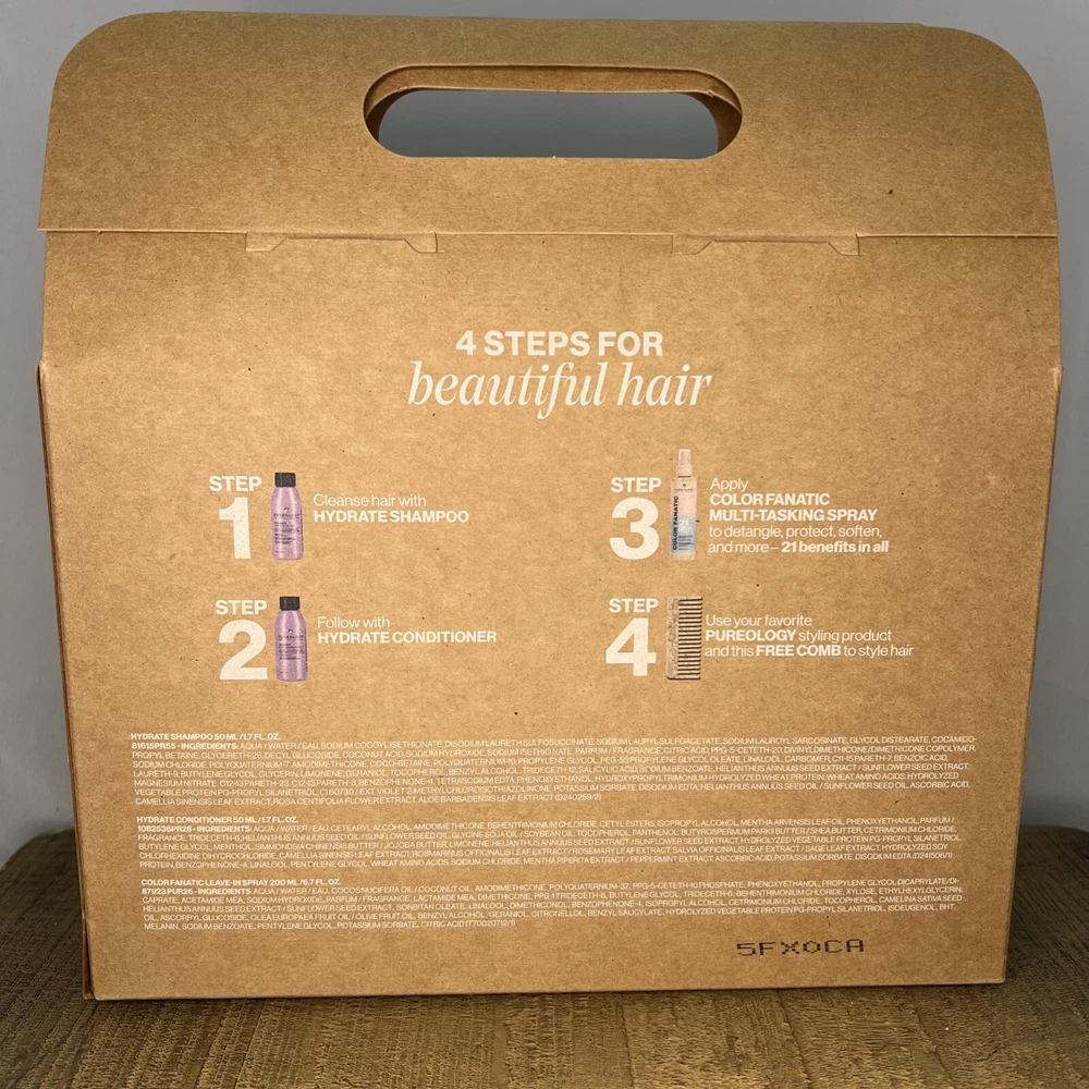 Pureology color fanatic set Shampoo and Conditioner & leave in spray plus comb. Slight cosmetic damage to exterior packaging. See photos for details. 5FXOCA