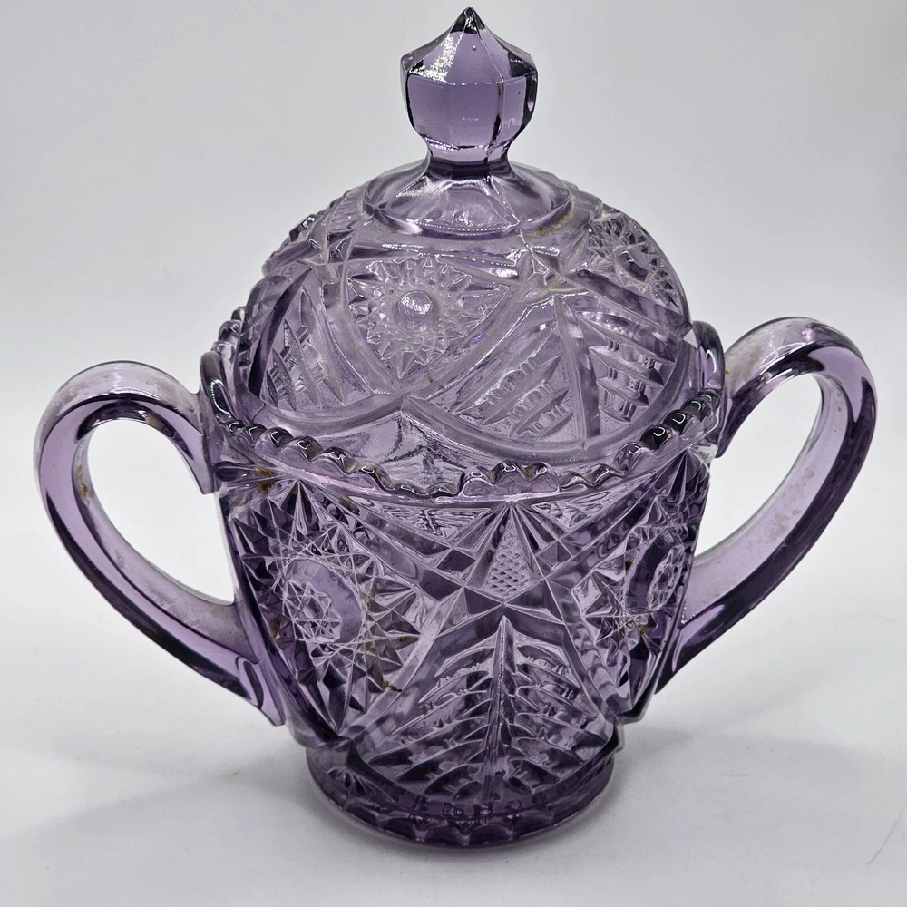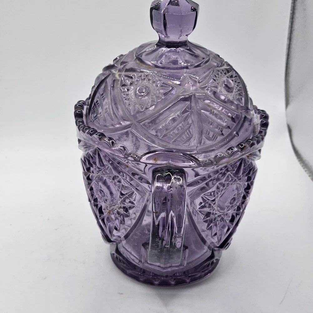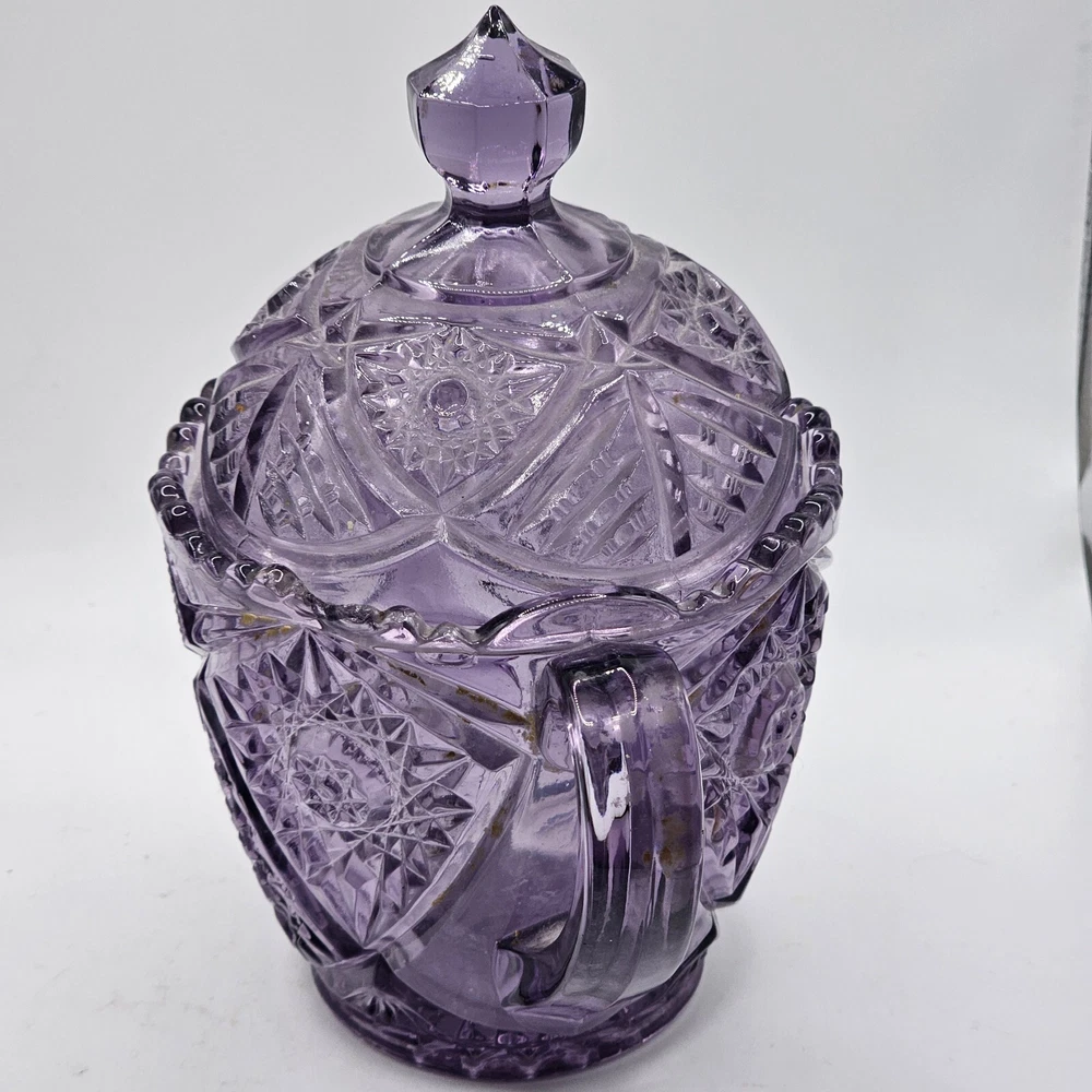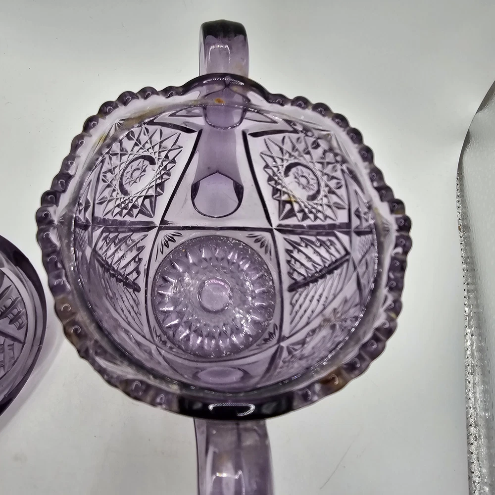 This vintage candy dish is a stunning addition to any collection. The ornate design features an etched cut glass lid and is made of high-quality glass material. The dish is perfect for storing candies, nuts, or other small items. The brand is unmarked, adding to the unique and timeless appeal of the piece. The production style is cut glass, a technique that adds depth and texture to the dish. The purple color is rich and vibrant, making it a standout item on any tabletop. This candy dish is a must-have for collectors of vintage glassware. There is a rough edge along rim... feels like chipping. Sold as is