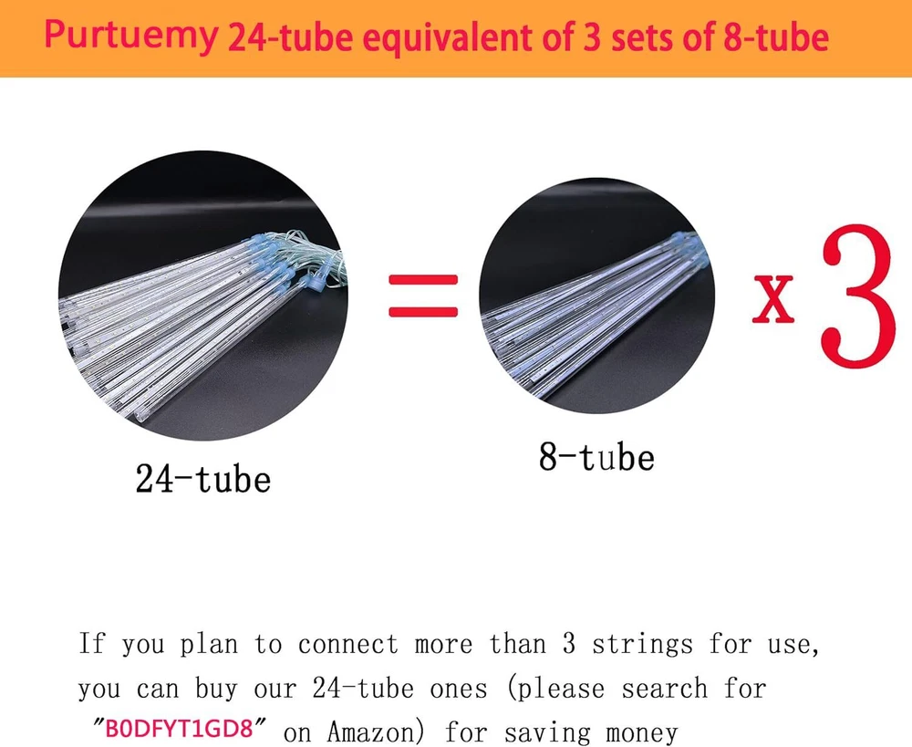 Purtuemy Lighting, Make the Night Colorful! In this challenging year of 2020, I hope to bring good luck and blessings to everyone and every family. These dripping icicle lights outdoor falls at random to make a pretty display, they act like a meteor shower crosses the sky. At the start, these patio hanging string lights drop at the same time and then there will be a slight delay between each tube to run out of sequence, which is more natural and beautiful. Use these hanging tree lights add fairy and romantic atmosphere for festivals or parties. They are perfect Christmas lights for decorating trees, and other Christmas decoration or outdoor decoration. Noted: 1. Please note that the plug is NOT waterproof so that please keep the plug away from water. 2. Please make sure the male/female connectors are connected correctly. If you can not turn on the whole light or 8 tubes, it is caused by the false connection for the connectors, please disconnect them and change another direction to connect them again. 3. If you get a set with 8 tubes cascading at the same time, just plug it for a certain time, it will cascade at random, Because every tube has an individual IC control, every tube will fall at random. Specifications: Plug types: US Plug LED bulbs of per tube: 18 Tube Quantity: 8 Tubes Number of LED bulbs: 8 Tubes x 17LED Tube length: 30cm/ 11.8inch Tube Dia.: 1cm/0.4inch Total length: 320cm/10.5ft Working Voltage: 110V-220V Watt: 5W How is the lights effect? These lights are amazing! Perfect for adding a touch of color to outdoor decor. Hang them from a multi-branched birch tree in the yard.About ten sets hanging from the tree are perfect because they are impressive and cool to watch. (One key thing that you will put the electrical plugs into plastic containers to keep them out of the rain or snow. ) 【Romantic Outdoor Christmas Lights for House】 - Falling rain lights are a set of white LED meteor shower tube lights that providing a wonderful glittering effect. The lights of each bulb turn on and off one by one (as many as 4 string lights), quickly like a meteor shower or a snow falling in the night sky. 【Holiday & Christmas Decoration】- These white christmas lights add a nice touch to your outdoor decorations, you can hung them from a multi-branched tree in front yard, and the more you string them together, the more spectacular they look, for example, you can connect about ten sets on the tree, they will be very impressive and cool to watch.Ther are very popular for Christmas, Halloween, Thanksgiving Day,New Year, Wedding, Party.Suit for Homes Decoration, Halloween Decoration, Xmas Decoration. 【High Quality & Waterproof】- These Christmas tree lights are waterproof, dust proof; transparent PC material, corrosion resistant, cost resistant, aging resistant, more durable. Every tube has an individual IC, every tube will fall at random. They are ideal outdoor decorations for Christmas. 【Energy Efficient & Specs Detail】 - Low power consumption and energy saving. Tube length: 12 inch; tube quantity: 8 tubes; length of power cord: 320cm/10.5ft; total length of 8 tubes: 30cm/ 11.8inch; voltage: 110V-220V, watt: 5W 【Wide Application】These Christmas cascading lights are perfect to decorate trees along street/park/ river, hang along the roof, great for market engineering lighting, urban and architectural beautification. Ideal for patio, yard, garden, hotel hall, shopping mall decoration.