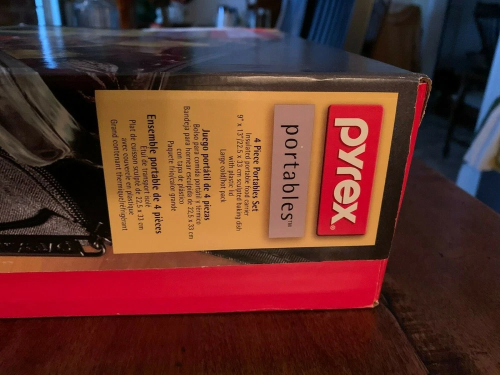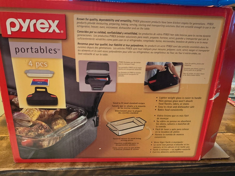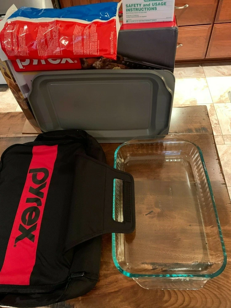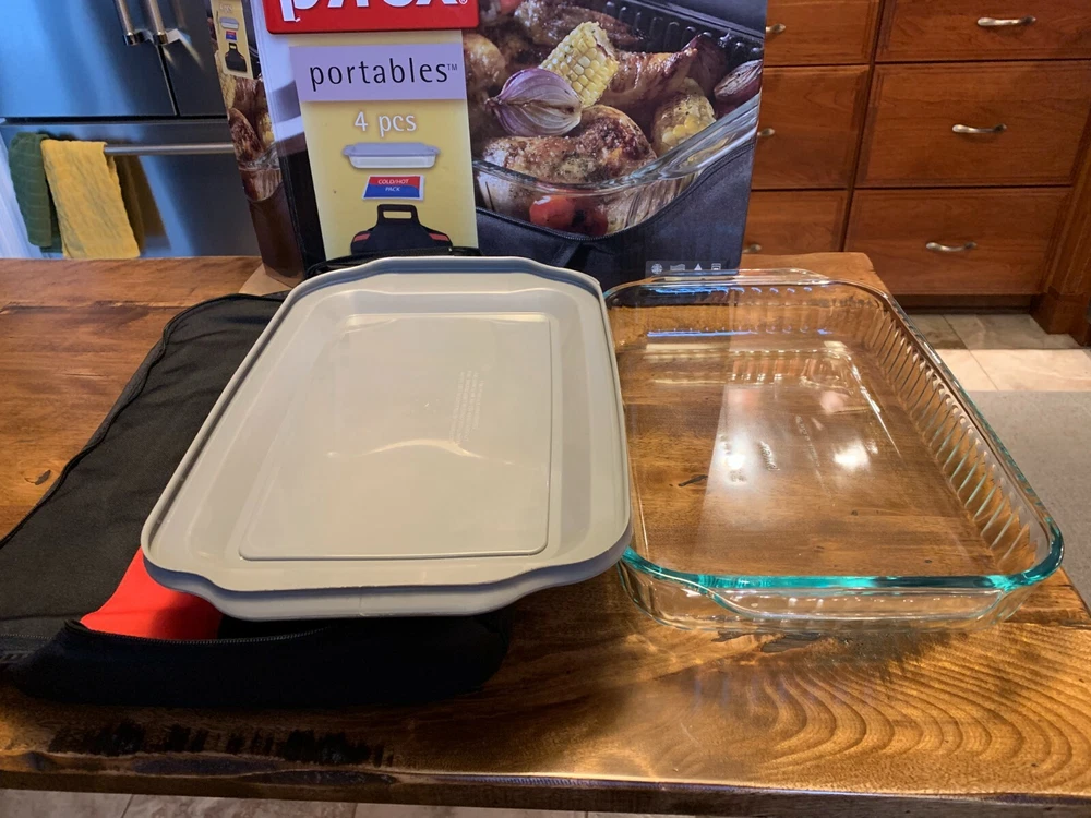 Pyrex 4-piece Portables Set - 3 Qt. - with Black Carry Bag - New in Box. Transport food safely and easily at the perfect temperature. Large Pyrex baking dish with a designed-to-fit insulated bag. The dish has a snug-fitting lid to prevent spills Included is a hot/cold pack - no re-heating or chilling necessary. Durable high-quality tempered glass dish for even heating Sturdy, easy-to-clean bag keeps dishes warm or cool as they travel Bag has easy-open, easy-close secure zipper and comfortable handle for a sure grip Dish resists stains and does not absorb food odors or flavors Dish is dishwasher, freezer, microwave and preheated-oven safe BPA-free plastic lid is top-rack dishwasher, freezer and microwave safe Made in the U.S Dish Measures 16 1/2" L x 11 1/4" W x 3" H. Though it has not been used, there are a few light scratches on the bottom of the dish. Please take a moment to check out my other items for sale. Thanks for looking!!