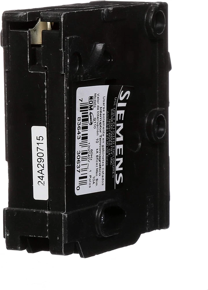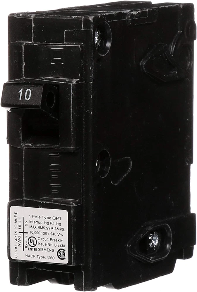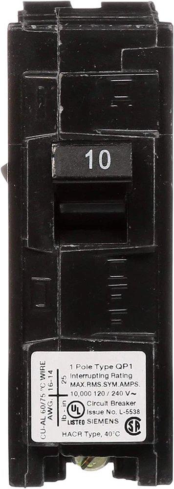 Single pole, 10 Amp, 120V type QP Circuit Breaker 10,000 AIC interrupting rating Siemens type QP circuit breakers provide easy plug-in connections in Siemens enclosures and the time saving insta-wire feature Compatible with Siemens PL and ES series load centers Use for overload and short-circuit protection of your electrical system Siemens offers a wide array of thermal-magnetic circuit breakers that are the key element for overload and short-circuit protection of your home's electrical system. To provide additional protection Siemens offers circuit breakers to protect against severe electrical shock or electrocution, mitigate the risk of electrical fires and protect against damaging surges and Voltage spikes. Circuit breakers are intended for switching and protection of your home's wiring from high temperatures caused by excess current higher than the rating of the wire. While thermal-magnetic circuit breakers are the key element for overload and short-circuit protection of your electrical system, there are potentially dangerous conditions that do not involve over current. To ensure the warranty on a Siemens panel is not voided, the use of Siemens breakers is required. Siemens strongly recommends against the use of "used" breakers. The installation of used breakers in a Siemens panel will void the warranty on the panel. Siemens does not sell used breakers and has not approved any 3rd party sellers to do so.