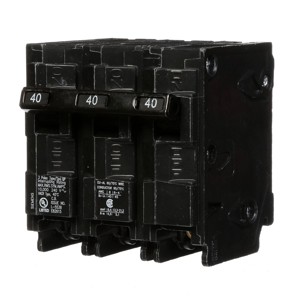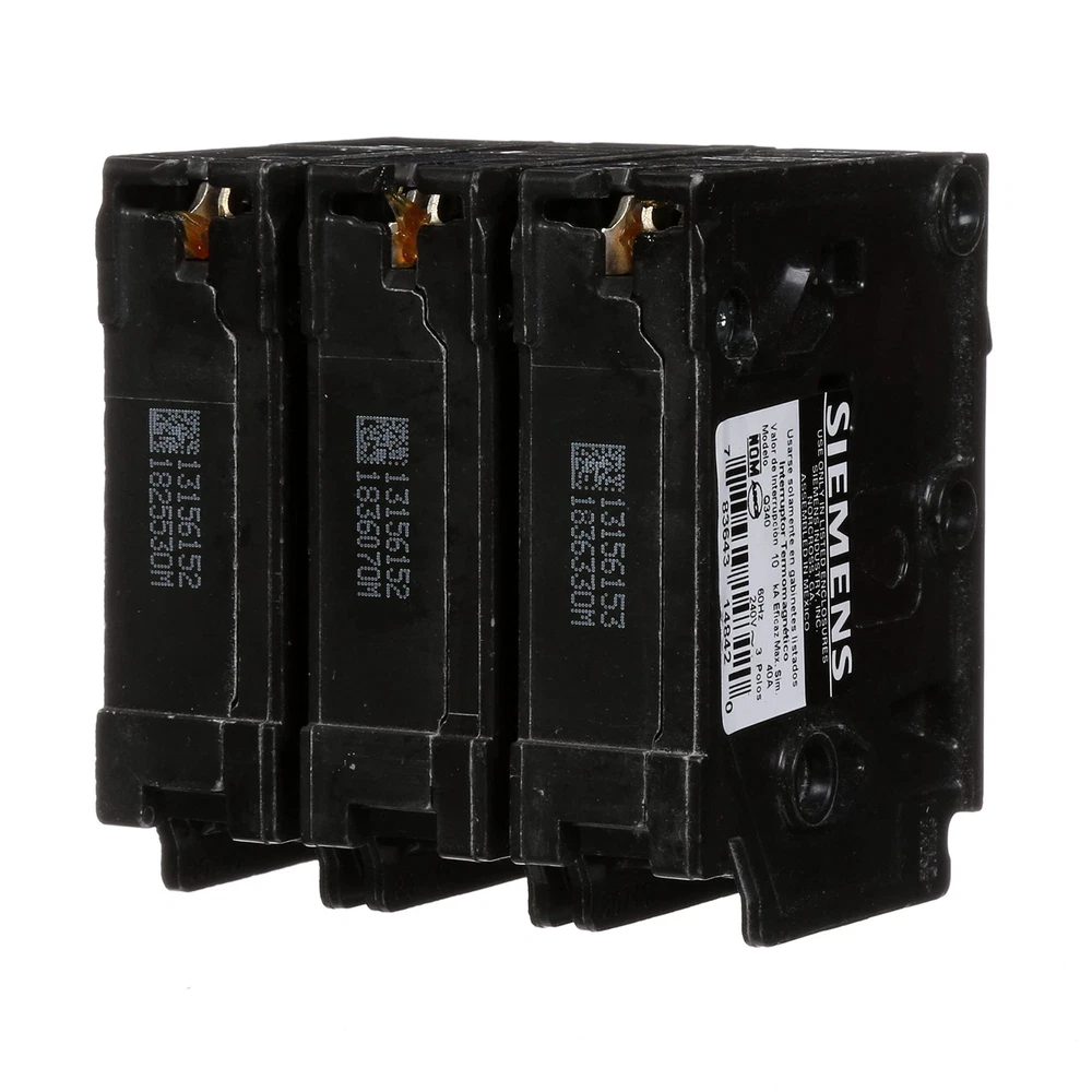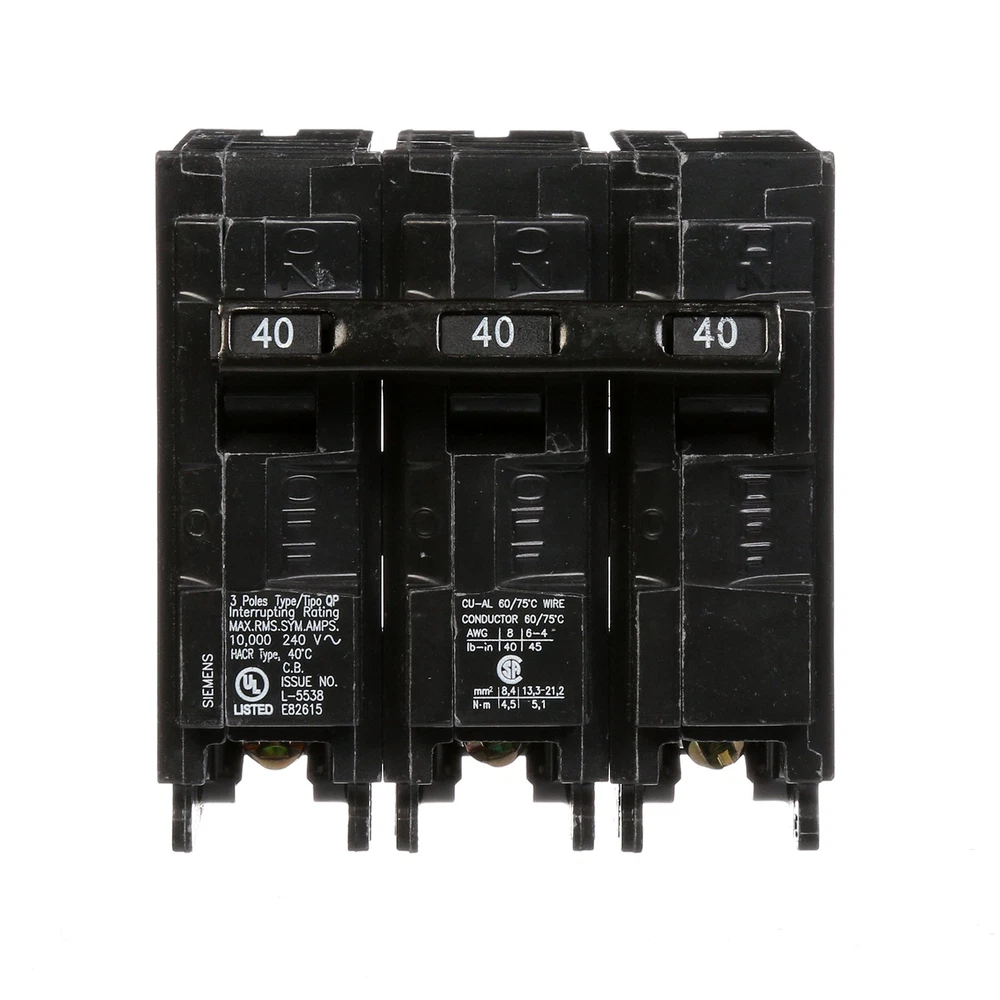 offers a wide array of thermal-magnetic circuit breakers that are the key element for overload and short-circuit protection of your home's electrical system. To provide additional protection offers circuit breakers to protect against severe electrical shock or electrocution, mitigate the risk of electrical fires and protect against damaging surges and Voltage spikes. Circuit breakers are intended for switching and protection of your home's wiring from high temperatures caused by excess current higher than the rating of the wire. While thermal-magnetic circuit breakers are the key element for overload and short-circuit protection of your electrical system, there are potentially dangerous conditions that do not involve over current. To ensure the on a panel is not voided, the use of breakers is required. strongly recommends against the use of "used" breakers. The installation of used breakers in a panel will void the on the panel. does not sell used breakers and has not approved any 3rd party sellers to do so. Three pole, 40 Amp, 240V type QP Circuit Breaker 10,000 AIC interrupting rating type QP circuit breakers provide easy plug-in connections in enclosures and the time saving insta-wire feature with PL and ES series load centers Use for overload and short-circuit protection of your electrical system