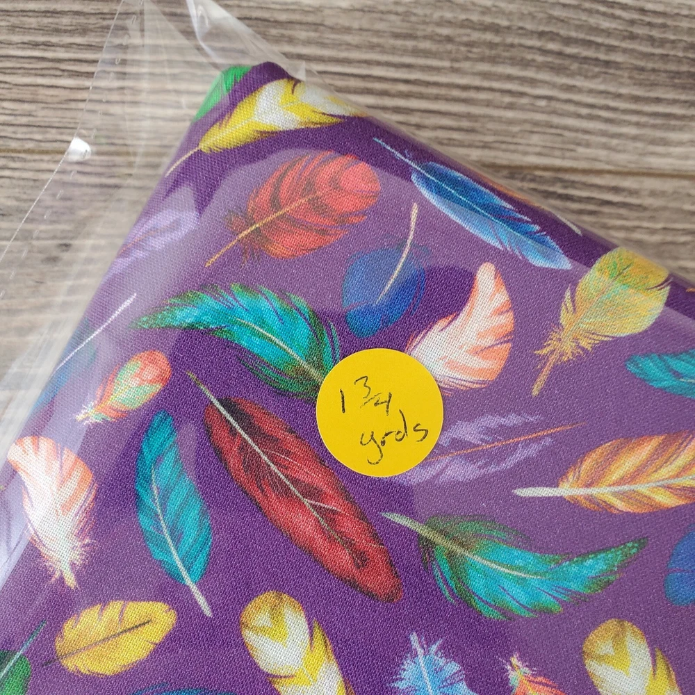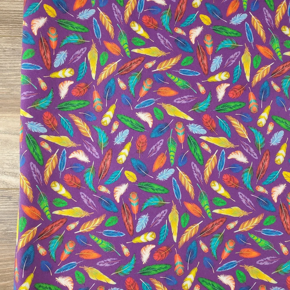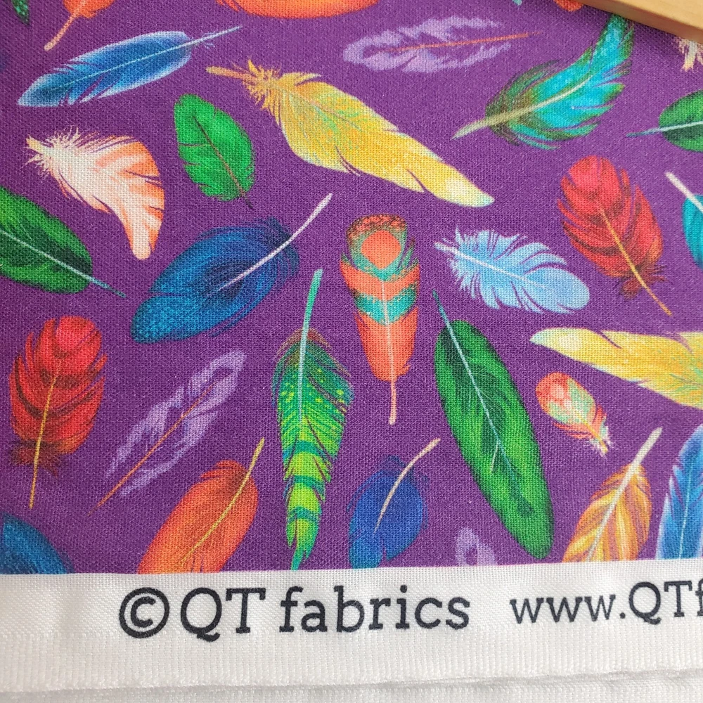 QT Fabrics Vibrant Feathers on Purple 1 3/4 yards (63") Cotton Quilting Fabric Single Piece measures 63" or 1 3/4 yards Fabric has been washed without detergent and dried and cut. It is unused and in excellent condition. Selling off my large collection of fabric. All fabrics were purchased new and prewashed upon receiving FABRIC has been pre-washed Width is standard for the print 40" or wider Contents: 100% Cotton Care: Machine Wash/Tumble Dry Low