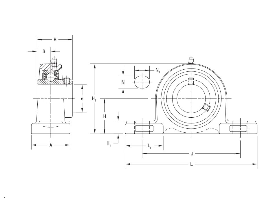 Specifications Bearing Number UC204-12 Shaft Size d 3/4 in Weight 0.70 Kg 1.5 lb Locking Style Set Screw Locking Housing Construction Two-Bolt Pillow Block Dimensions Base to Center Height H 33.30 mm 1.311 in Total Length L 127.00 mm 5.000 in Housing Width A 38.00 mm 1.496 in Bolt Hole Spacing J 95.00 mm 3.740 in Bolt Hole Size N 13.00 mm 0.512 in Bolt Hole Length N1 18.00 mm 0.709 in Foot Height H1 16.00 mm 0.630 in Total Height H2 65.00 mm 2.563 in Dimension L1 36 mm 1.406 in Inner Ring Width B 31.00 mm 1.220 in Center of Bearing from End S 12.7 mm 0.500 in Basic Load Ratings Static Load Rating 1495 lbf 6650 N Dynamic Load Rating 2878 lbf 12800 N