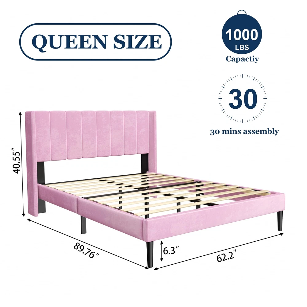 LUXURY WING BACK: Wide backrest design provides unrivaled stability, prevents pillows from slipping, and supports your head and shoulders as you lean against the headboard. Sturdy & Resistant: Made with a sturdy high-quality metal frame and center support legs blend naturally into the sturdy frame to provide dense and strong support. Weight capacity: 1000 Lbs. Thoughtful Design: 6" under-bed storage space is perfect for storing extra odds and ends. The sound-quieting features of the foot pads and sound-absorbing foam ensure a good night’s sleep. No Box Spring Needed: Durable velcro wooden slats are designed to support and extend the life of your latex, memory foam, or spring mattress. Mattress thickness recommended being 8"-12". Quick Setup: Easy to assemble in about 30 minutes, enjoy a hassle-free installation with no additional tools or springs.