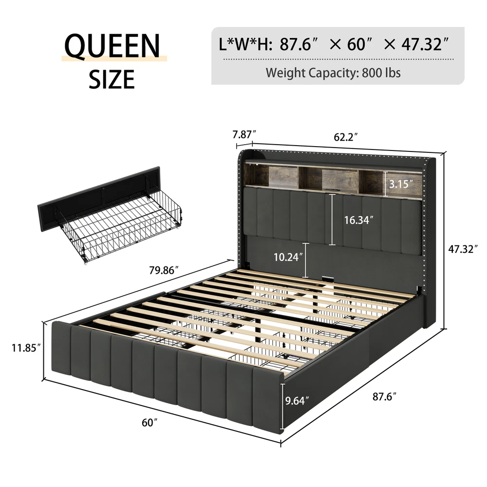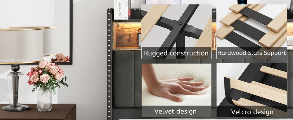 Brand Unbranded Item Length 65.5 Item Width 18.70 Item Height 10.60 Color Antique Gray Frame Material Fabric Metal Type BED FRAME Compatible Mattress Size As described Diamond-ring-1 Simple life Queen Bed Frame with Storage Headboard, Wooden Bed Frame with 47.2" Bookcase Headboard, 4 Storage Drawers & Charging Station, No Box Spring Needed/Noise Free/All-Metal Support, Vintage Gray 【Large-Capacity Storage Bookcase Headboard】 Storage shelves on the headboard not only provides you with large storage space, but also makes it convenient for you to place or retrieve commonly used items such as books, phones, alarms, etc. It is a very practical design. 【Practical Built-in Charging Station】The storage headboard is equipped with a built-in charging station, including 2 AC Outlets, a USB port and a type-C port, allowing you to charge various electronic devices within easy reach. 【4 Lockable Storage Drawers】Four under bed storage drawers serve as hidden storage spaces, providing you with more storage space and making your bedroom look clean and tidy. The drawer can be fixed to the bedside with a latch to prevent it from slipping out. Multi-Function RGB LED Light: Enhance your home experience with the bed frame's RGB LED light strip. Easily personalize the LED color, brightness, modes, and timing functions with mobile app. Clear instructions walk you through the straightforward setup process, allowing you to craft a dynamic and tailored ambiance to suit various styles and occasions Sturdy Structure & No Box Spring Required: The queen size platform bed frame features a combination of an ultra-durable metal frame and wooden slats, ensuring even support and superior weight distribution. With a weight capacity of 1000 lbs, it offers a strong sense of security and promotes restful sleep without the need for a box spring Item Specifics Brand Unbranded Item Length 65.5 Item Width 18.70 Item Height 10.60 Color Antique Gray Frame Material Fabric Metal Type BED FRAME Compatible Mattress Size As described Payment Returns Diamond-ring-1 Simple life DESCRIPTION PAYMENT SHIPPING RETURN POLICY CONTACT US Shop Category Store Home Other Hot Item Delivery New List Item Help & Info Payment Policy Shipping Policy Return Policy FAQ About Us Queen Bed Frame with Storage Headboard, Wooden Bed Frame with 47.2" Bookcase Headboard, 4 Storage Drawers & Charging Station, No Box Spring Needed/Noise Free/All-Metal Support, Vintage Gray 【Large-Capacity Storage Bookcase Headboard】 Storage shelves on the headboard not only provides you with large storage space, but also makes it convenient for you to place or retrieve commonly used items such as books, phones, alarms, etc. It is a very practical design. 【Practical Built-in Charging Station】The storage headboard is equipped with a built-in charging station, including 2 AC Outlets, a USB port and a type-C port, allowing you to charge various electronic devices within easy reach. 【4 Lockable Storage Drawers】Four under bed storage drawers serve as hidden storage spaces, providing you with more storage space and making your bedroom look clean and tidy. The drawer can be fixed to the bedside with a latch to prevent it from slipping out. Multi-Function RGB LED Light: Enhance your home experience with the bed frame's RGB LED light strip. Easily personalize the LED color, brightness, modes, and timing functions with mobile app. Clear instructions walk you through the straightforward setup process, allowing you to craft a dynamic and tailored ambiance to suit various styles and occasions Sturdy Structure & No Box Spring Required: The queen size platform bed frame features a combination of an ultra-durable metal frame and wooden slats, ensuring even support and superior weight distribution. With a weight capacity of 1000 lbs, it offers a strong sense of security and promotes restful sleep without the need for a box spring Item Specifics Brand : Unbranded Item Length : 65.5 Item Width : 18.70 Item Height : 10.60 Color : Antique Gray Frame Material : Fabric Metal Type : BED FRAME Compatible Mattress Size : As described Payment Returns All rights reserved.