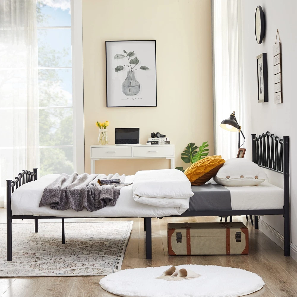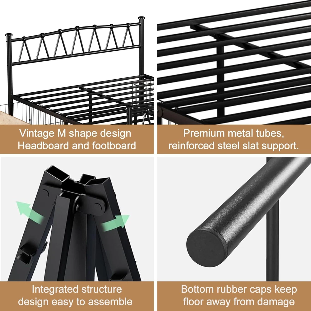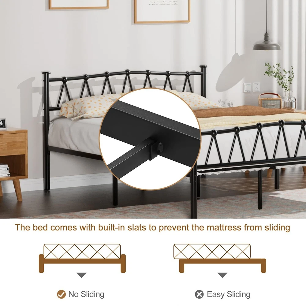 Specifications: Color:Matte Black Style:Vintage Bridge Material: Iron Size: Queen: 80”x 60.2”x 35” Headboard Height :35" Footboard Height :23.6" Max Load Capacity: 660 lb Package Contents: 1 x Bed frame 1 x Accessory Kit 1 x Instructions Queen Bed Frame: 80"L x 35"H x 60.2"W,the headboard and footboard feature decorative round finial posts,Suitable for modern style, Nordic style, American country style. Sturdy and Durable: With Updated Heavy Duty Metal Slats, Side rails and supporting legs, this twin size bed frame is capable of holding up to 660 lbs,Providing your mattress with strong support. Underbed Clearance: This bed frame owns 13.7" under bed clearance,you can store suitcases,shoes, toys, and make your bedroom more tidy. Noise Free & Anti-slip Design-Reinforced corner braces can effectively improve structural stability and prevent squeaky noise. The side rails of this metal bed frame are carefully designed to be higher than the inserted slats, preventing the mattress from sliding noticeably,whether memory foam, latex, hybrid or spring mattresses. Worry-Free-Each package comes with a clear and detailed instruction, an adult can handle in under an hour by following the installation;FREE Return &1-YEAR Warranty,If there are any problems with the product you received, please contact us.