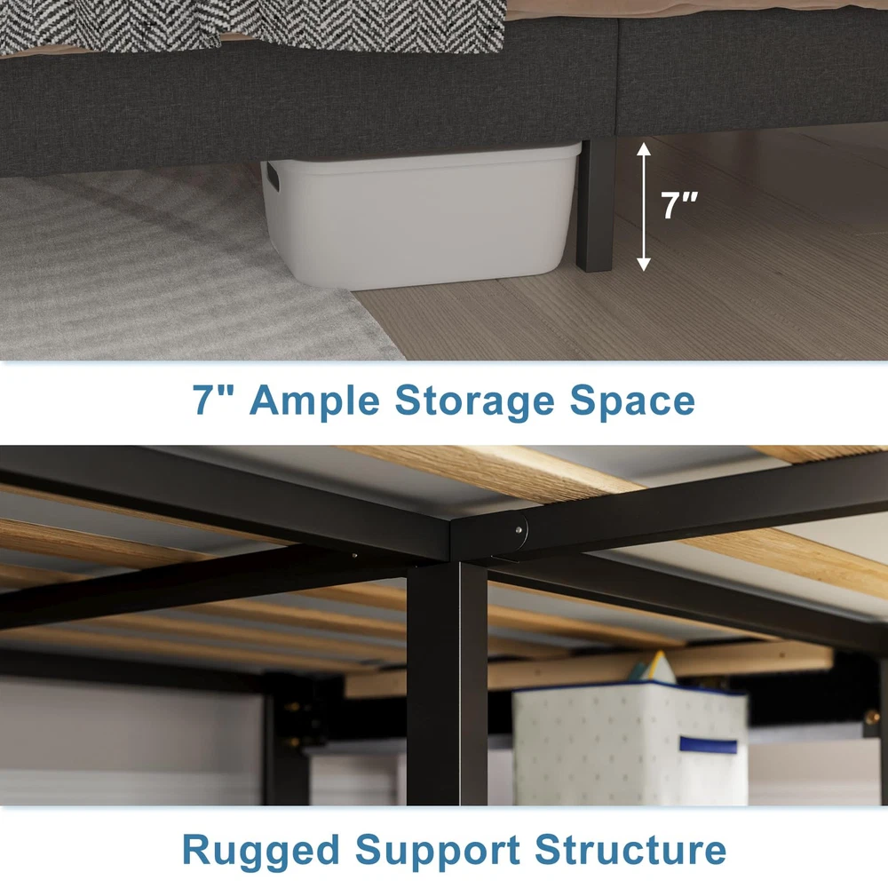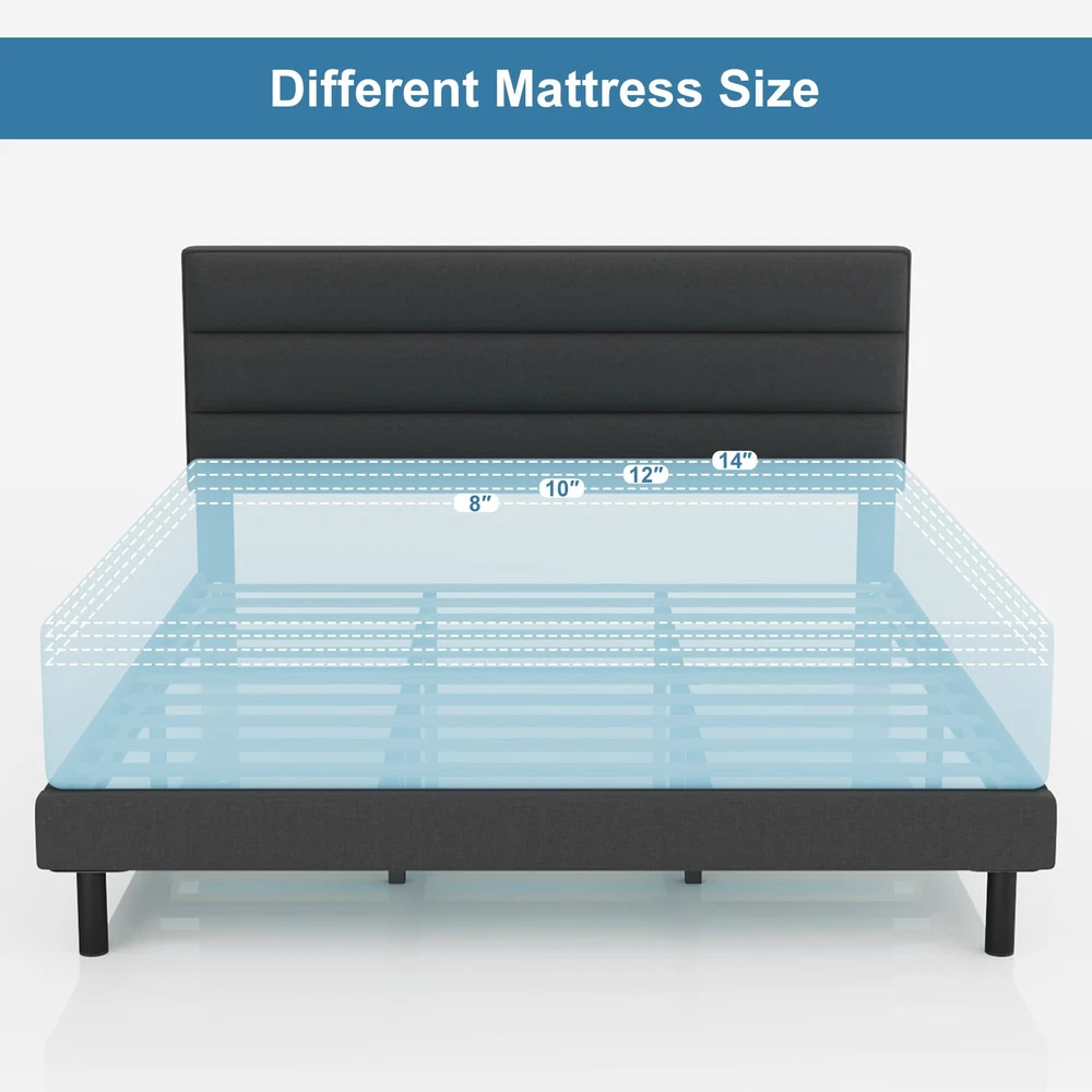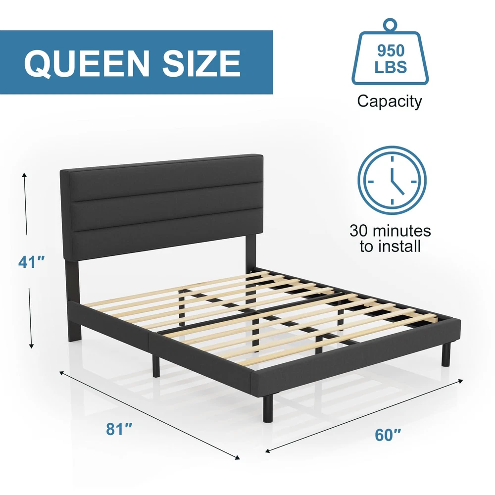 Modern Design:The queen bed frames comes with an upholstered headboard so you can relax or read with your back to the headboard Sturdy Metals Support:The queen size bed Frames is constructed from high-hardness Metals, ensuring exceptional stability; A central leg support system helps prevent sagging No Spring Box Needed:The Bed Frames queen size include sturdy slats that allow the mattress to be placed directly on top of the bed slats,no need for a spring box Easy Assembly:All the parts needed for assembly are stored inside the headboard and each part is clearly labeled for easy identification;You can assemble it in about 30 minutes Adhesion: The feet of the bed frames have non-slip pads to protect the floor and reduce the sound of friction