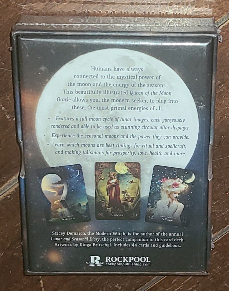 Publication Year:2018Language:EnglishFormat:Cards,Flash CardsTopic:Divination / Tarot, Witchcraft (See Also Religion / Wicca), Magick StudiesSynopsis:For countless millennia, humans have connected to the mystical power of the moon and the energy of the seasons. For our ancient ancestors, the earliest veneration and sacred honouring was of the Moon, the seasons, the cycles of light and dark, hot and cold and fertility and rest, and this beautifully illustrated Queen of the Moon Oracle allows you, the modern seeker, to plug into these, the most primal energies of all. Consult this oracle, based in ancient wisdom and receive the answers to your modern problems. Features a full moon cycle of lunar images, each beautifully illustrated and able to be used as stunning circular altar displays. Experience the seasonal moons and the power they can provide. Learn which moons are best timings for ritual, spellcraft and making talismans for prosperity, love, health and more. This is the perfect companion to the author's bestselling annual Lunar and Seasonal Diar y and is for anyone who loves to sit or dance under a big silvery moon., For countless millennia, humans have connected to the mystical power of the moon and the energy of the seasons. For our ancient ancestors, the earliest veneration and sacred honoring was of the moon, the seasons, and the cycles of light and dark, hot and cold and fertility and rest, and this beautifully illustrated Queen of the Moon Oracle allows you, the modern seeker, to plug in to these most primal energies. Consult this oracle based in ancient wisdom and receive the answers to your modern problems. Features a full moon cycle of lunar images, each beautifully illustrated and able to be used as stunning circular altar displays. Experience the seasonal moons and the power they can provide. Learn which times in the moon's cycle are best for ritual, spell craft and making talismans for prosperity, love, health and more. This is the perfect companion to the author's best-selling annual Lunar and Seasonal Diary and is perfect for anyone who loves to sit or dance under a big silvery moon.Genre:Body, Mind & Spiritbrand:Rockpool PublishingItem Weight:12 OzISBN-13:9781925682588Book Title:Queen of the Moon Oracle : Guidance Through Lunar and Seasonal Energiesgtin13:9781925682588Number of Pages:112 PagesItem Height:1.4 inReviews:"Universally, people are reclaiming the power of their feminist energy. DeMarco, author of Witch in the Boardroom , has earned her credentials to speak to this issue through decades of writing and teaching. The choice of Kinga Britshgi's digitalized surrealism and fantasy artwork, framed with dark whimsy, makes this a cutting-edge deck with great appeal for the younger generations. 44-card deck and 108-page full-color guidebook." - Anna Jedrziewski , Retailing InsightsIntended Audience:TradePublisher:Rockpool PublishingItem Width:0.1 inItem Length:0.2 inIllustrator:YesAuthor:Stacey DemarcoISBN-10:1925682587