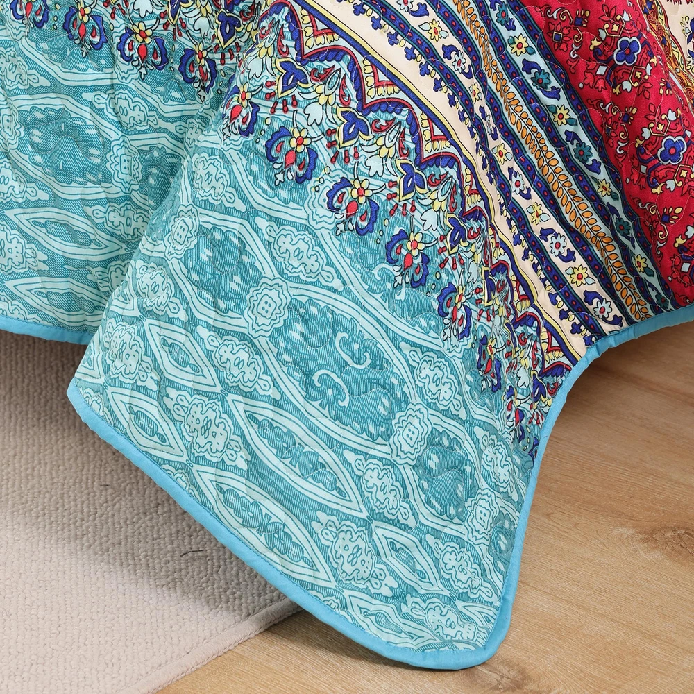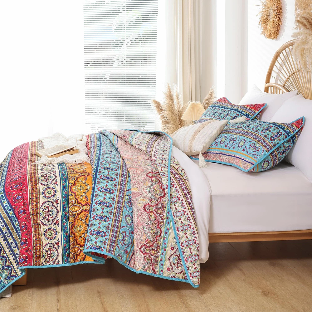 BOHO QUILT SET : This summer bedding include:1*Quilt (90" x 90"inches) and 2*Pillow Cases (26" x 20"inches). Made of Microfiber Polyester. Soft, lightweight and durable. High quality material has the features of non-fading, anti - pilling and stains resistant for increasing using longevity.(Notice: Pillow cases is randomly tailored from the whole fabric to match the duvet cover, maybe not totally same as the pictures.Please kindly understand pillow cases design are different.) SOFT WARM & COMFORTABLE DESIGN: Boho quilt set is reversible, both sides could be used individually. Cozy and breathable to keep you extremely comfortable all night long. Durable bed cover provide warmth and softness for you and your family. Beautiful versatile quilt creats a comfortable sleeping environment for good night rest. BOHO STYLE: The queen quilt bedding set is designed with multiple elements and vibrant colors, creating a lively atmosphere for your bedroom or guest room. Ideal for birthdays, wedding, holidays, Christmas and more. Durable bedspread sets are perfect for family with pets or . MULTI-PURPOSE ALL SEASON USAGE: This quilt designed for all season. Perfect thickness coverlet quilt for summer. As well as a blanket for winter, enough filling to keep warm. Use it as quilt,bedspread, blanket or bed cover. EASY CARE: Machine wash cold, gentle cycle, tumble dry low. Tightly stitching on the edging of quilt set will hold up well through repeatly washing.