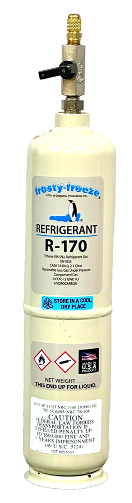 R170, 4 Liquid oz., Ultra-Low-Temperature Refrigerant, Replaces R13, R23, R503 & R508B *Includes professional Check & Charge-It Kit with 36" Charging Hose Contains 4 Liquid oz. 1/4" male flare hose connection with on/off valve. For Ultra-Low-Temp Refrigeration Systems Replaces R13, R23, R503 & R508B *Contains 4 Liquid Ounces of refrigerant R170. R170 (ethane) is used as a replacement refrigerant for older, high-GWP refrigerants in low-temperature and ultra-low temperature refrigeration systems. Replacing options like R23 and R508B . As a natural hydrocarbon refrigerant, it has a zero Ozone Depletion Potential (ODP) and a very low Global Warming Potential (GWP), making it an environmentally friendly choice for new equipment . However, it is highly flammable, so it's typically used in small liquid quantities or as part of a mixed refrigerant to ensure safety. EPA SNAP approved! For low stage of a cascade systems that typically operate below -80°F. Main uses of HC refrigerant ethane gas It is mainly used to replace R23 and R508b refrigerants in low-temperature or ultra-low temperature refrigeration equipment; because R170 is flammable, it is usually only used in low-temperature refrigeration equipment with a small amount of liquid, or as a component of low-temperature mixed refrigerant; R170 is compatible with traditional lubricants. R-170 refrigerant cylinders are pressurized containers, which are flammable and explosive. They should be stored away from fire, heat, and direct sunlight. They are usually stored in a cool, dry and ventilated warehouse; they should be loaded and unloaded with care. , To prevent damage to accessories such as cylinders and valves. Achieve ultimate cooling with our R170 ethane refrigerant, boasting ultra-low temperature capabilities for demanding cryogenic applications. Experience superior performance and reliability. Enjoy peace of mind knowing our R170 refrigerant is high purity, minimizing contaminants and ensuring optimal system efficiency. A clean refrigerant for a clean process. Embrace sustainability with our environmentally friendly ethane refrigerant, offering a lower global warming potential (GWP) compared to traditional alternatives. Choose a greener solution. Perfect for diverse low-temperature equipment, from laboratory freezers to industrial cooling systems. Versatile and reliable for a wide range of cryogenic needs. Guaranteed quality and safety: Our R170 ethane refrigerant undergoes rigorous testing to meet the highest industry standards. Trust in our commitment to excellence.