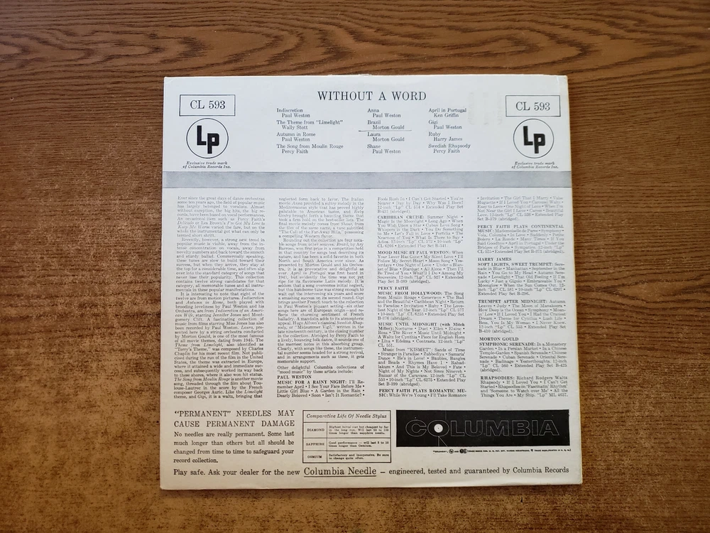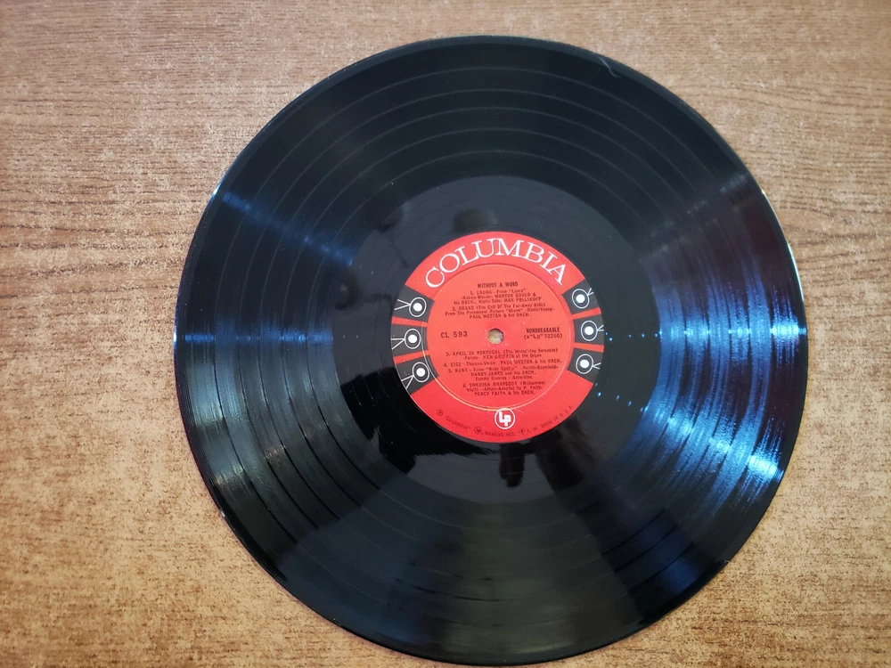 UPDATED SALES AVAILABLE NOW! (BUY 5, 1 free if all $5.99 or less) & buy $50, $5 off, OR buy 2 & 15% off! sales rules apply (buy few at $4.99 sale ended) WE DO COMBINED SHIPPING . 1ST PRESSING! RARE! CHEAP INTERNATIONAL SHIPPING! NO HIGH priced SHIPPING!!! RARE 1954 MINT-EXC Various – Without A Word CL593 LP33 .....12" COMBINED SHIP 2.00 USD to 3.00 USD OFF EXTRA RECORDS. BUY 2 OR 3 OR 4, 1 FREE (ALSO FOR 45 BUYERS!! BUY 200 USD OF 7" 45'S AND SHIP USA FOR 20 USD FLAT OR OUTSIDE USA FOR 50 USD). EBAY'S #1 RECORD STORE!! ORIGINAL SLEEVE AND NEW GENERICS FREE. I ACCEPT ALL CURRENCIES - FOREIGN NON USA BUYERS GET 80% OFF SHIPPING EXTRA RECORDS, YOU DON'T HAVE TO USE EBAY GLOBAL SHIPPING, WE HAVE LESS EXPENSIVE, FIRST CLASS shipping ,I fill out customs form. You opt out of ebay global shipping, EBAY sends invoice shipping for about 20 USD, unless larger package, WE HAVE SALES REP IN EVERY COUNTRY, SO NO EXTRA CHARGES FOR BUYERS!! just pay your invoice here on ebay -- 80% off every extra record for international buyers (((any ebay checkout problems I TAKE CARE OF))) QUESTIONS? EMAIL ME. All USA buyers get $2 to $3 off in shipping for every extra record and for international, FOREIGN BUYERS, receive 80% off every extra record in combined shipping , ((we use all new strong boxes, bubble wrap, cardboard, and lots of padding, post office and customs charges by weight and size but we want to make sure you get your records safely outside of USA, we have sales representatives in your country, so you won't have expensive import fees, duties, vat, as with same tracking we ship to our representative in your country, and then with the tracking we post here on to you, so your invoice will be your total charges, so you save a lot of money buy buying with us and not being charged expensive fees, all of this is included in combined shipping)) EXTRA HEAVY BOX SETS OF MULTIPLE RECORDS DO RECIEVE A COMBINED SHIPPING DISCOUNT, PLEASE CLICK ON REQUEST AN INVOICE WHEN YOU CHECK OUT AS THESE PRICES VARY BASED ON SIZE AND WEIGHT OF BOX SETS, -----buyers outside of USA, receive 80% off in shipping on every extra item you buy, on any type of record, YOU DO NOT HAVE TO USE EBAY GLOBAL SHIPPPING PROGRAM AS MY INTERNATIONAL BUYERS COMPLAIN IT IS TOO EXPENSIVE SO YOU MUST OPT OUT OF EBAY GLOBAL SHIPPING IF YOU PREFER, WHAT I DO IS WHICH IS A VERY SPECIAL US POSTAL FIRST CLASS INTERNATIONAL SERVICE FOR MY BUYERS IS CHARGE A FLAT RATE AROUND $20 USD. We have sales representatives in every country so you only pay the invoice here on ebay, no extra charges for import, vat or duties. I follow EBAY's record grading rules from MINT to Good--, beware of those that do not grade their records properly and make sure the photos in the ad are the photos of actual record as mine are, I take every photo myself AND PACK EVERYTHING IN EXPENSIVE BUBBLE WRAP AND CARDBOARD BOX MAILERS, IT COSTS ME MORE THAN I CHARGE TO SHIP FOR ALL THE MATERIAL TO PROTECT THE RECORDS. AS EBAY KNOWS - S ome records could be worth near $100, $1000 or more as I am not a collector but a professional retail seller. International Buyers – I ACCEPT ALL CURRENCIES I have thousands of PROMO, DEMO, JUKEBOX, AUDITION RARE RECORDS ARE VERY RARE AS WELL; MANY OF MY RECORDS ARE FIRST PRESSINGS OR PROMO/DEMO/NOT FOR SALE SAMPLES MY PRICE IS MUCH LESS FOR QUALITY. . Postal rates increase every year BUT WE HAVE NOT RAISED USA OR INTERNATIONAL RATES IN YEARS and we do not sell any records as new or mint new, we do have NOS - means new old stock for old 78 rpms shellac but demonstrated at record store a few times and graded mint minus or mint--- sold as used. We grade per ((ebay record grading rules)) which can be googled, or listed at community.ebay, a list of grades is below, you can also call ebay for record grades: We do sell the below grades per ebay grading rules: mint--, means mint minus , sold as used even if unopened mint-exc, means between mint minus and excellent -- (ebay uses very good++ for excellent in ebay record grading rules) excellent, (ebay uses very good++ for excellent) very good+ means very good plus very good very good-- means very good minus DOES NOT mean very good! good+ means good plus good good-- means good minus fair+ means fair plus fair fair-- means fair minus poor -- we generally do not sell poor , . PLEASE READ EBAY GUARANTEE for buyers, separate from this posted listing (all our items are play tested and graded per ebay posted record grading rules in listing which anyone can google) as item specifics describe on this listing under type of listing this item is sold as is, so no returns/durations applicable. EBAY GUARANTEE applies to eligible listings per ebay rules posted on ebay website. (SHORT SUMMARY EXAMPLE - such as does not arrive, damaged by the postal service or customs in transit or if a criminal steals or tampers with package damaging the item as we scan bar codes, matrix, etcetera, we report thefts/tampering/fraud/crimes to ebay, postal police and local authorities and always get ebay service reference numbers for these issues TO ALWAYS PROTECT EBAY, EBAY BUYERS and sellers and can email top rated or power seller ebay awards we have won as top seller on ebay) This is a pet free no smoking household office one man operation, prior owner had a small cat and was also a non-smoker, so when he took photos once in a while, a stray tiny hair got into a photo, as photos are taken behind a small camera so hard to see any imperfection when a photo is taken which is not a scratch, so if you see a mark on a record photo in listing that is not a scratch or mark. I CLEAN RECORDS before I ship WITH AUTOMATED 1000 DOLLAR PROFESSIONAL RECORD STORE CLEANER so of course record will be clean and I ALSO INCLUDE FOR FREE NEW MINT GENERIC SLEEVES PAPER/POLY FREE IN YOUR PACKAGE. I SHIP IN BRAND NEW BOXES AND BRAND NEW CARDBOARD FLATS inside box for reinforcement & bubble wrap if necessary. We computer scan with bar code matrix scanner as all our items h